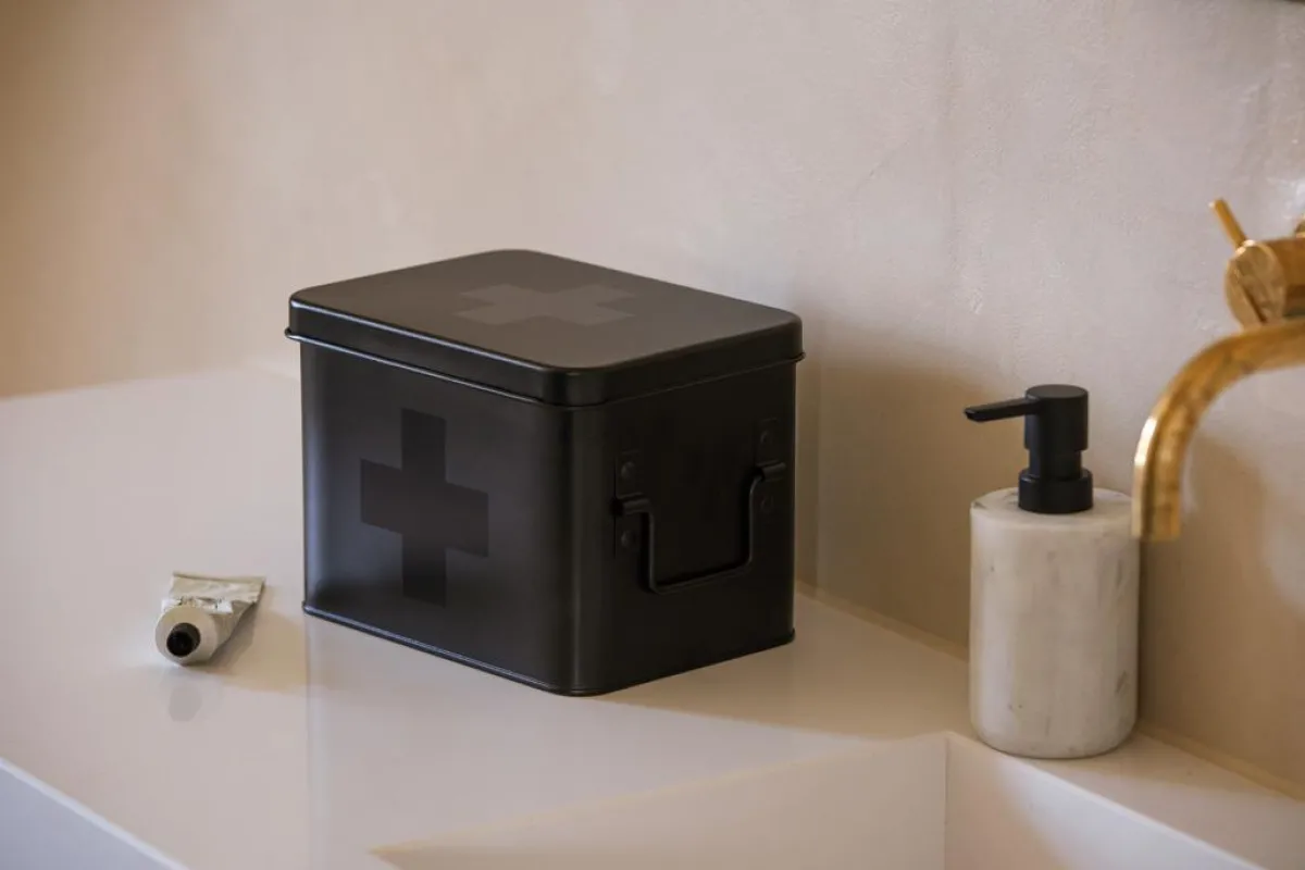 Dersom ulykken skulle være ute, er det smart å vite hvor du har det nødvendige av basis førstehjelpsutstyr hjemme. Denne kule sorte metallboksen er nettopp det du trenger til dette.