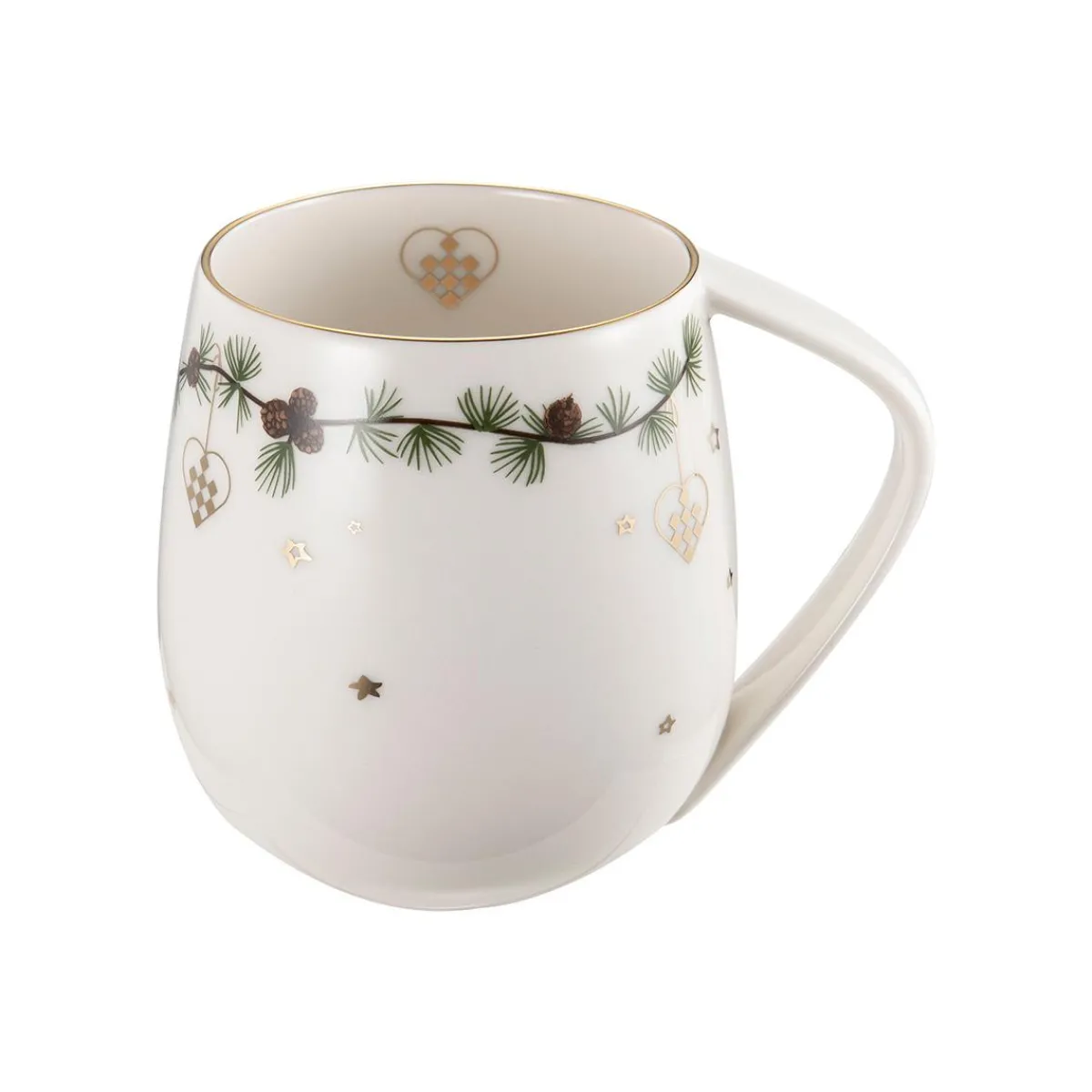 Et stemningsfullt julekrus med dekor av kongler, julehjerter og små gullstjerner. Perfekt til varme drikker gjennom hele desember. Den avrundede formen ligger godt i hånden og gir en lun følelse.