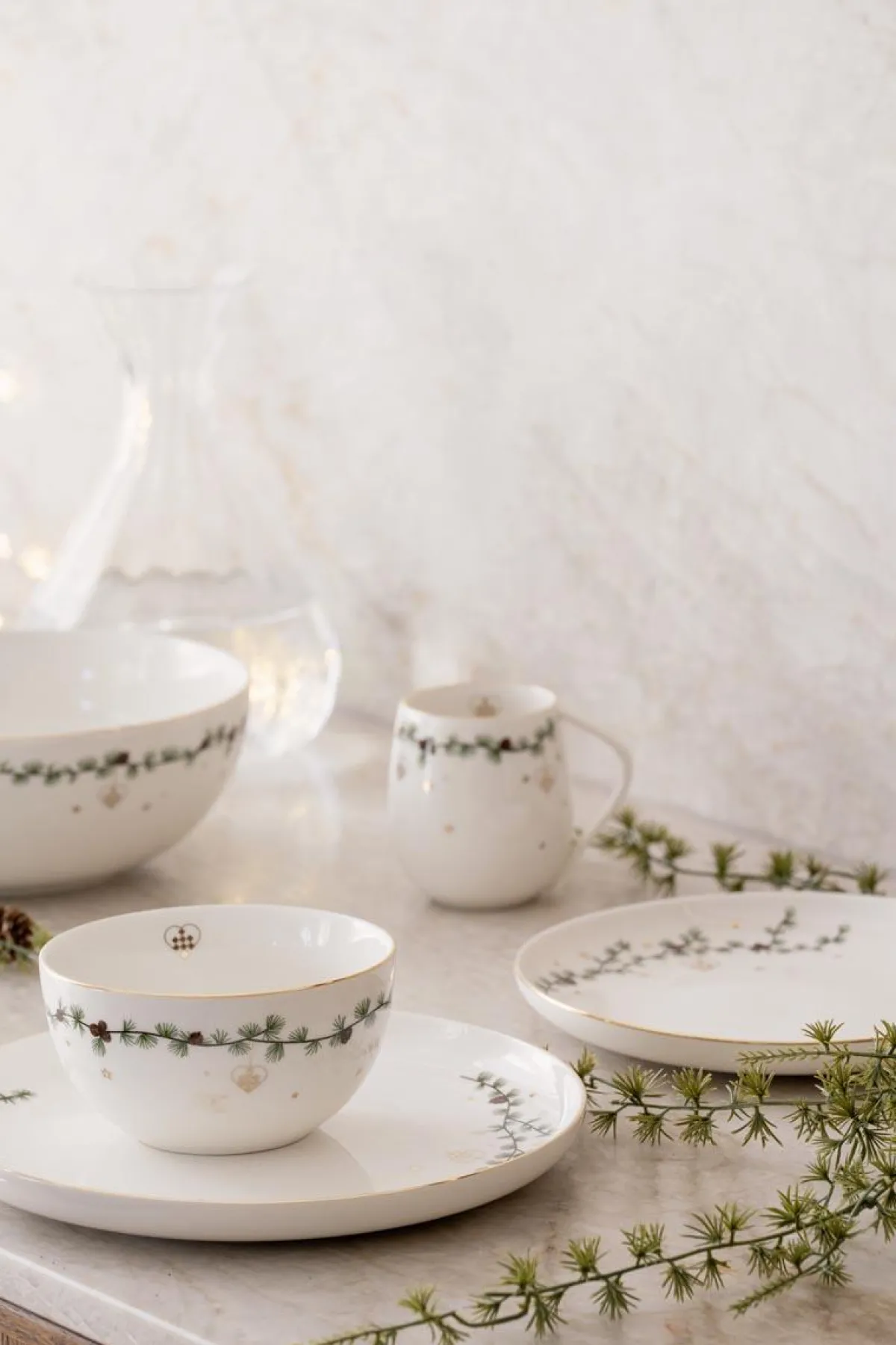 Elegant middagstallerken med klassisk julemotiv i grønt, gull og brunt. De fine detaljene med kongler, stjerner og julehjerte gir en varm og tradisjonell stemning til julemåltidet. Match gjerne med resten av serviset for en helhetlig borddekking.