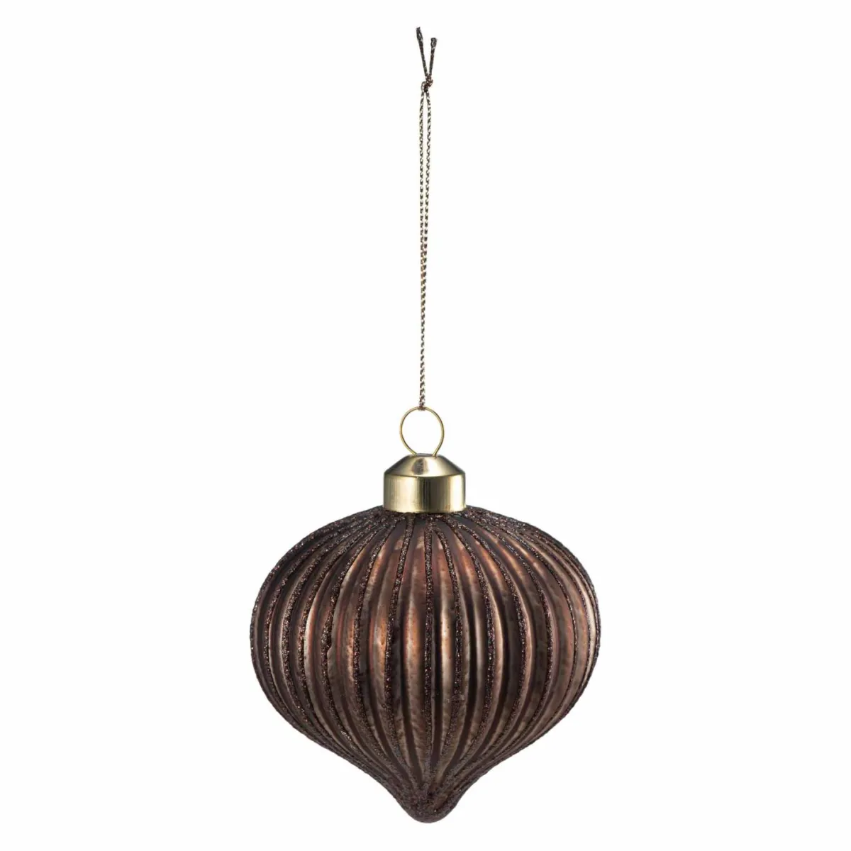 Nydelig brun julekule i glass med riller. Morsom og leken form som passer perfekt på juletreet denne julen. Frisk opp og pynt et tre som gjenspeiler din smak og personlighet. Kombiner den gjerne med de andre fargene av .