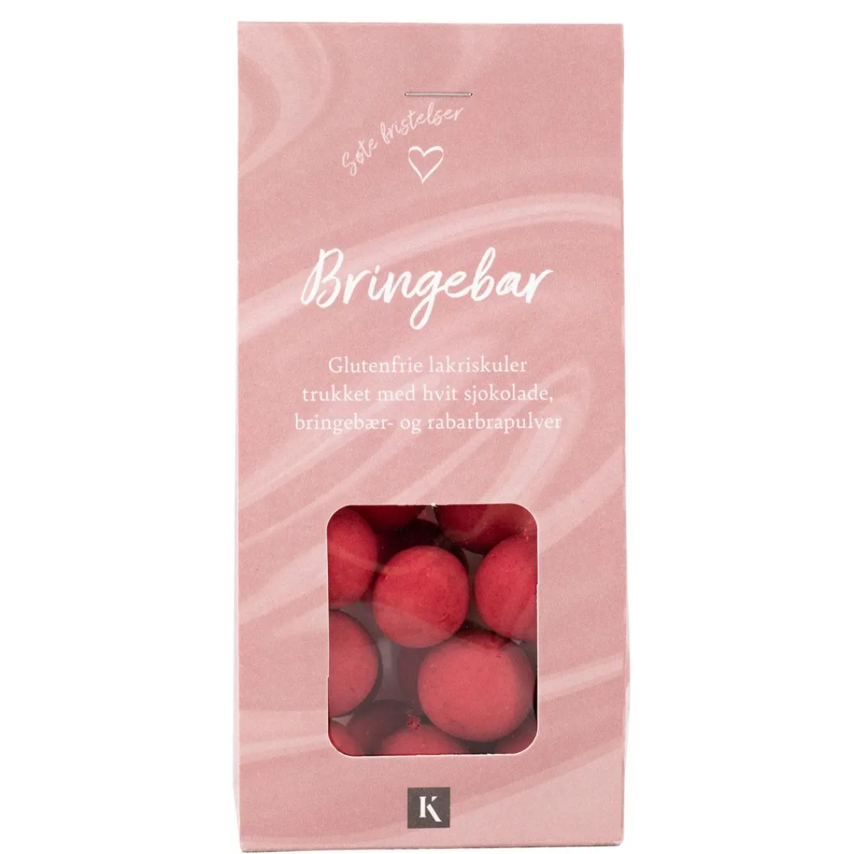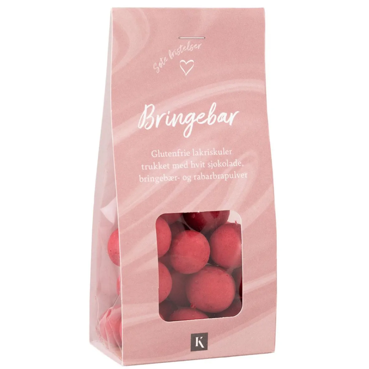 Ingredienser: Sukker, kakaosmør, melkepulver, sirup, maismel, invertsukker, lakris (1,7 %), salt, frysetørret bringebær, sitronsyre, aroma (vanilje, rabarbra), stabilisator (E420), konserveringsmiddel (E202), emulgator (E322 soyalecitin), fargestoff (E100, E120), overflatebehandlingsmiddel (kokosolje, E903)