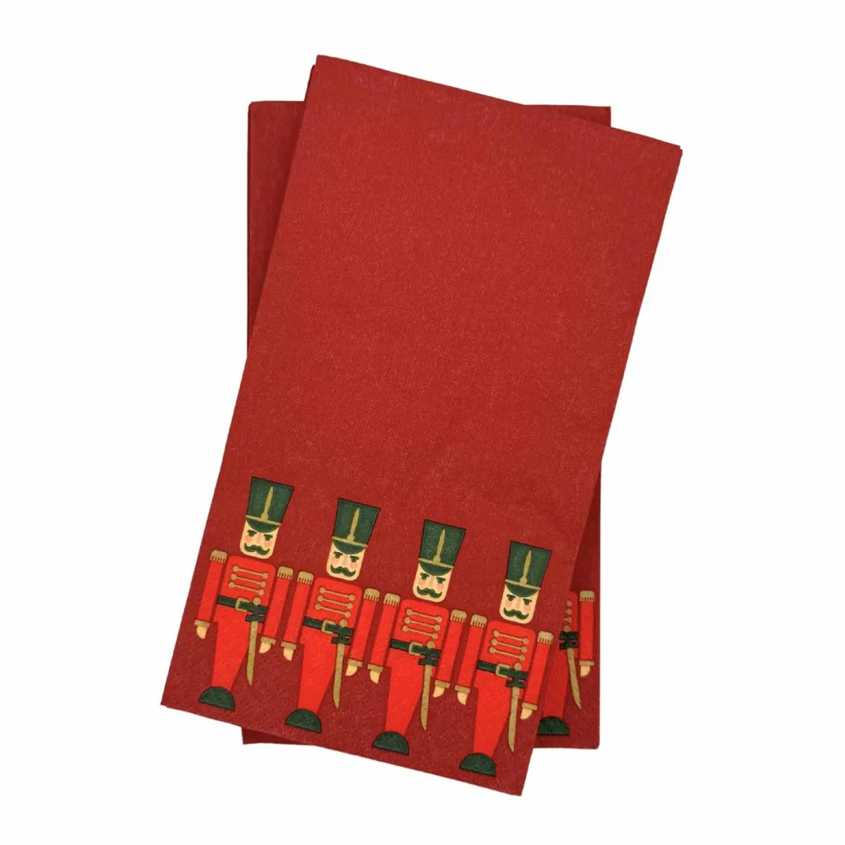 Disse papirserviettene har et sjarmerende design med marsjerende tinnsoldater på en dyp rød bakgrunn. De passer fint til juledekkingen eller vinterens festlige anledninger.