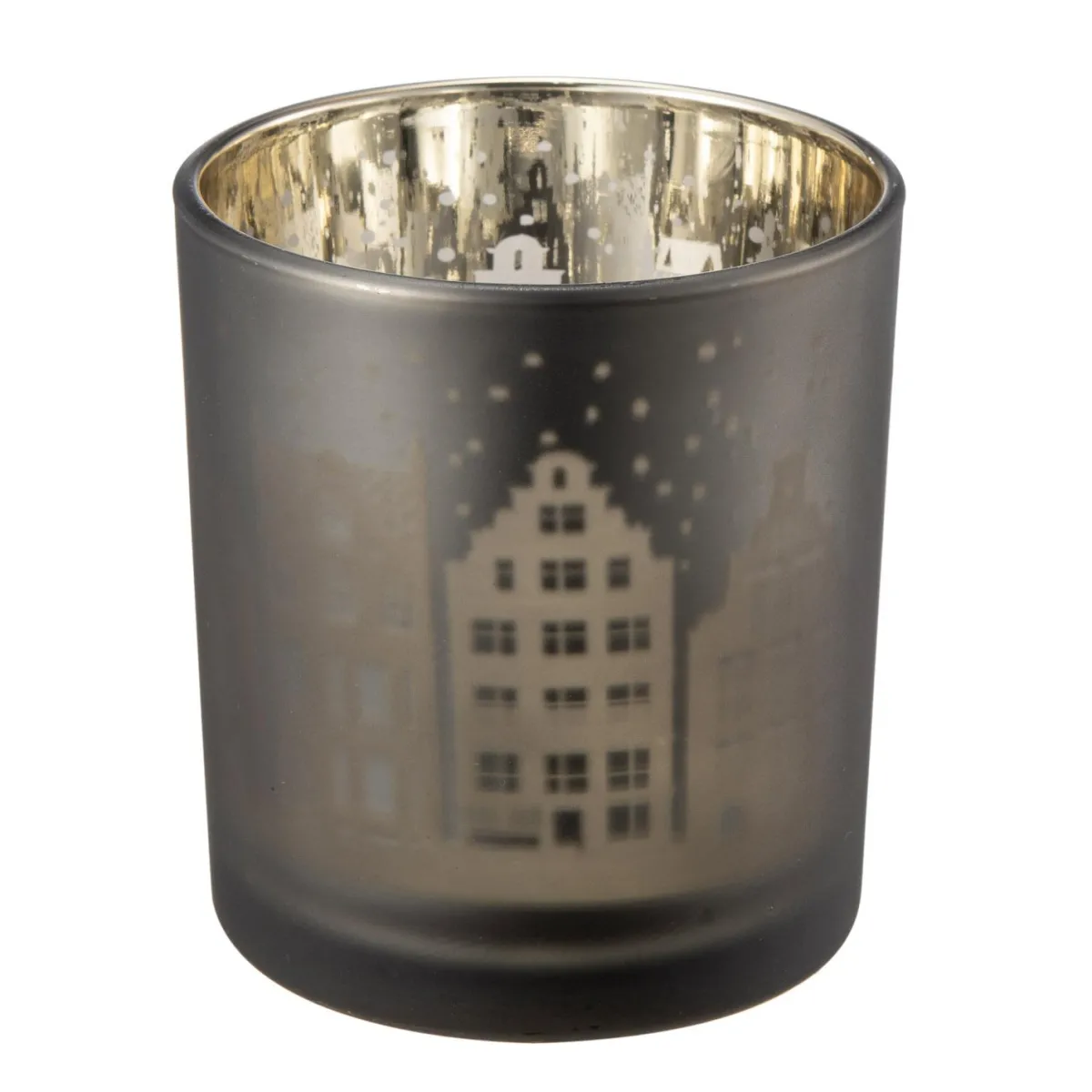 Det er noe helt spesielt med jul i byen. Fantastiske lys og god stemning! Ta med den fine julestemningen inn i hjemmet med den stilige telysholderen Amsterdam. Den har grå, matt finish på utsiden og blank innside som gjør at det fine by-motivet skinner ekstra godt. Telysholderen finnes i to størrelser og ser flotte ut sammen på et lysfat med annet dekor.