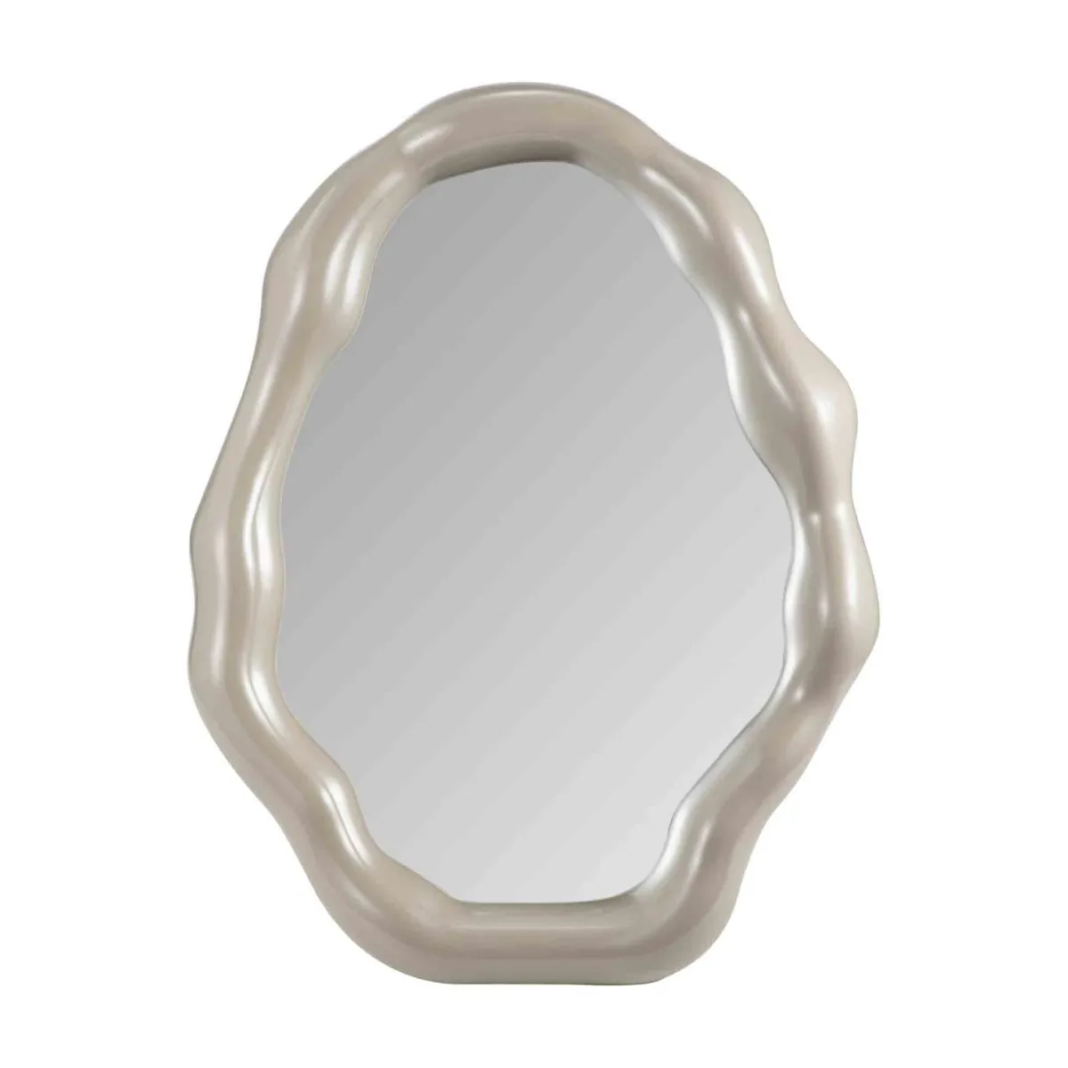 Oppgrader ditt interiør med dette moderne og organisk designede bordspeilet, som skiller seg ut med sin elegante beige ramme. Speilet kombinerer funksjonalitet med stil, og er det perfekte tilskuddet til ethvert rom. Speilet er ikke bare et praktisk tilbehør, men også et dekorativt element som vil forbedre rommets estetikk.