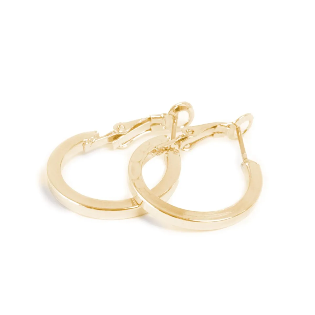Enkle øreringer i en blank gullfarget firkantprofil med en god klypelås som er lett å ta av og på. Kommer i flere størrelser, disse er de minste men likevel ikke så små.