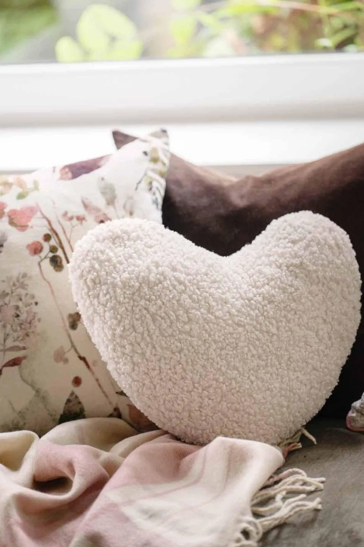 Hjerteformet pute i myk teddy gir en varm og leken detalj til sofaen, sengen eller en lesekrok. Sett den sammen med velurputer for en kontrast i teksturer, eller skap et harmonisk uttrykk med andre lyse puter i ulike former. Passer også som en søt gave til noen du setter pris på.