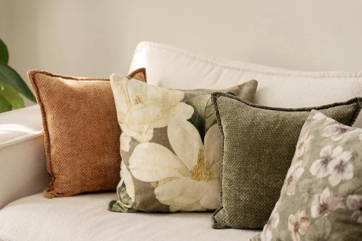 Store blomster i dempede toner gir en rolig og myk stemning i rommet. Putetrekket er i velur og passer godt sammen med andre i lin eller bomull. Kombiner med andre grønne nyanser sammen med nøytrale farger som brun og beige.