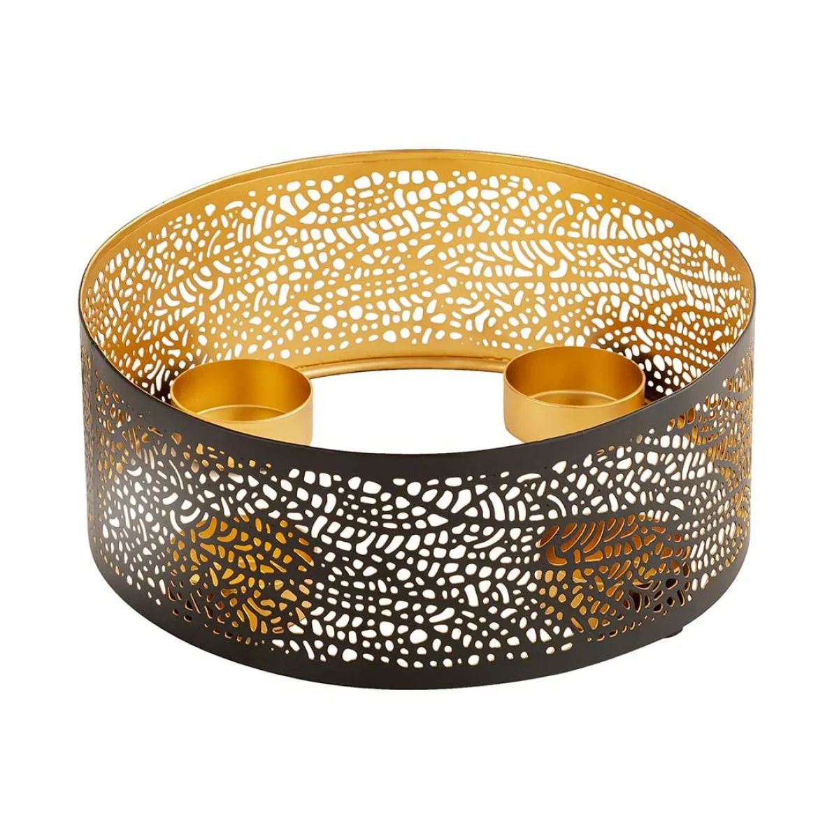Denne lysholderen t i metall har en dekorativ utskjæring og en gullfarget innside som skaper et vakkert lys når det brukes med telys. Lysholderen har plass til fire lys og passer fint som en adventsstake eller som en del av en annen dekorasjon. Plasser det på bordet, i vinduskarmen, eller hvor som helst du ønsker å tilføre en koselig stemning med lys. En flott måte å samle levende lys på ett sted, samtidig som det gir rommet et unikt preg.