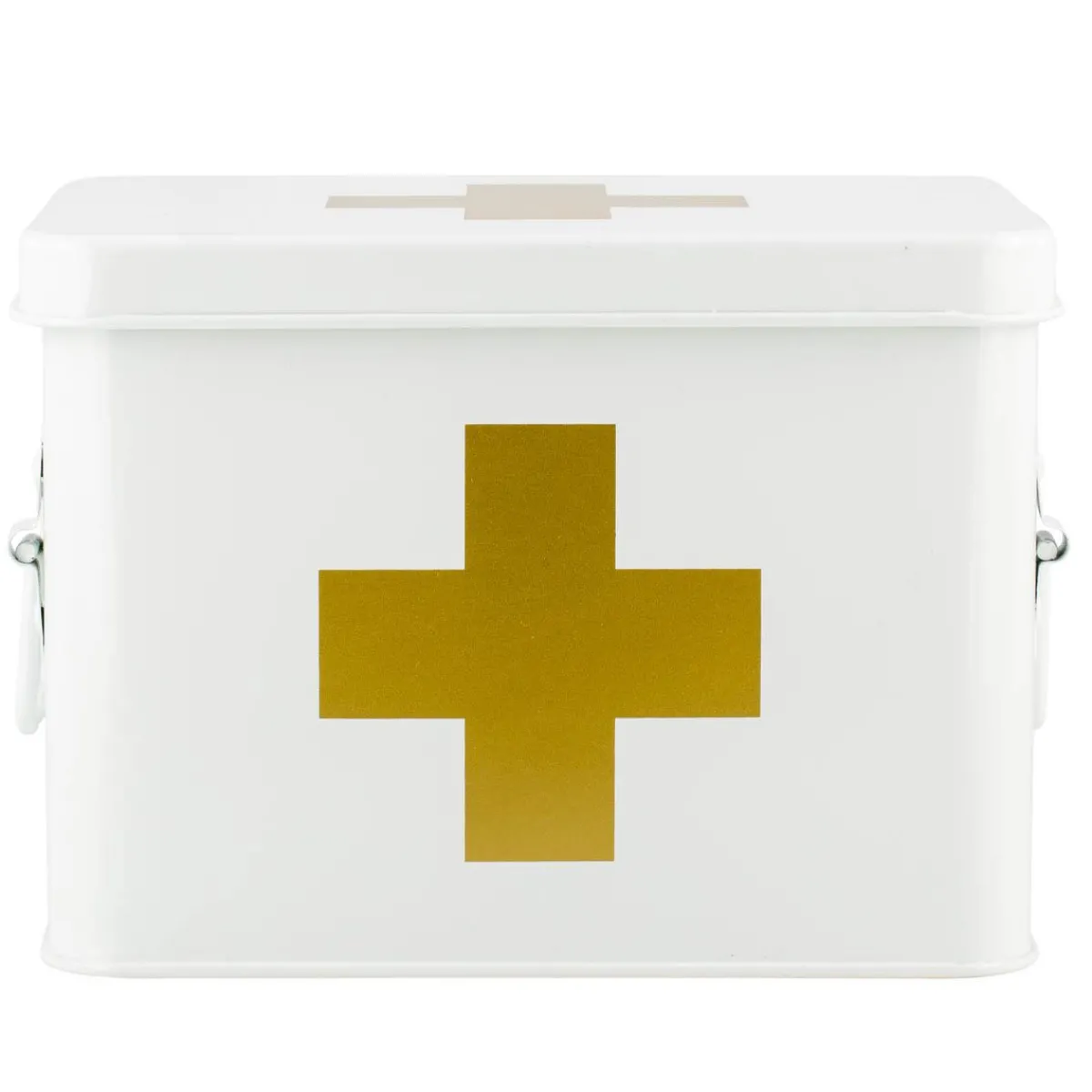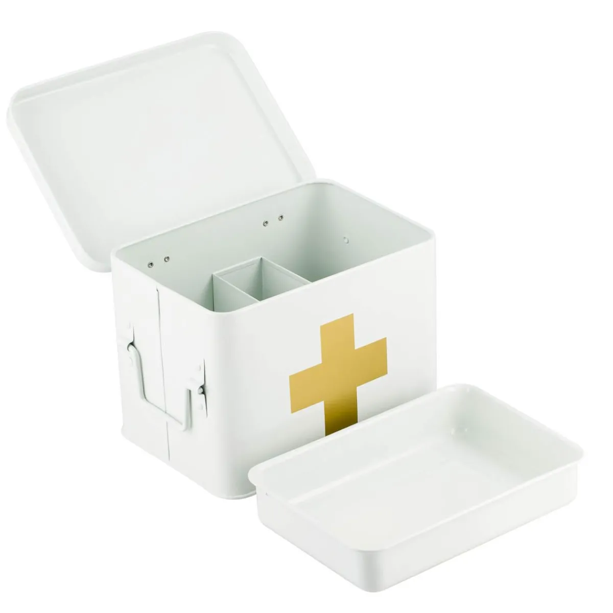 Når skaden skjer, er det viktig å vite hvor du har samlet elementære plaster, saks bandasjer og liknende. Boksen har en bunn inndelt i tre rom, og en beholder oppå som kan tas ut. Boksen er av stål, og tåler å stå i fuktige rom.