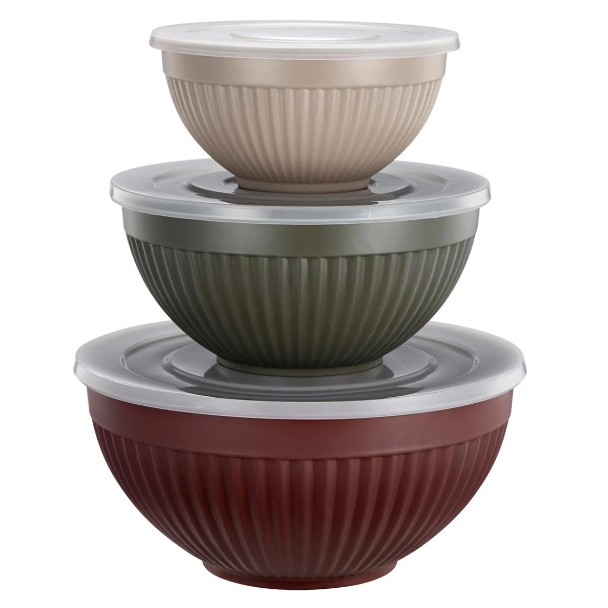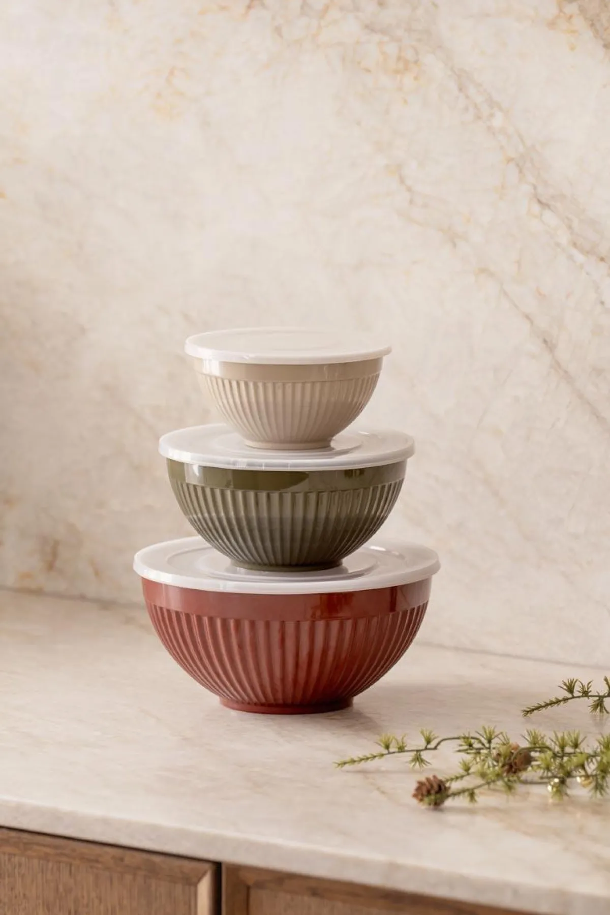 Praktisk sett med tre melaminboller med lokk. Perfekte til servering og oppbevaring, og de kan stables for å spare plass på kjøkkenet.