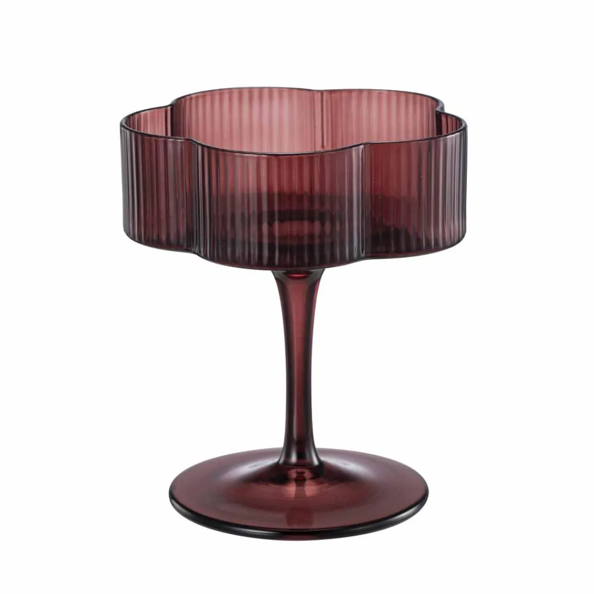 Rillet champagneglass i burgunder med blomsterformet kant. Perfekt når noe skal markeres, enten det er nyttår eller tirsdag. Her kan du også eller velge din favoritt for en ekstra gjennomført borddekking. Fin som gave, eller som en liten hverdagsglede til deg selv.