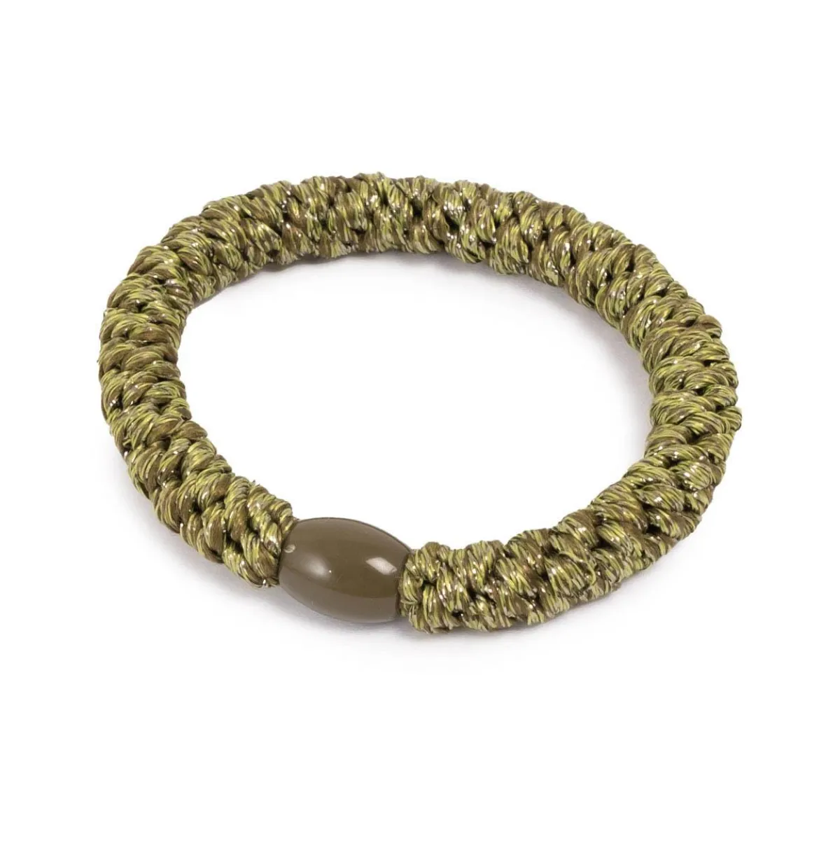 Elegant hårstrikk i lekre farger, oliven og gull med glitter.