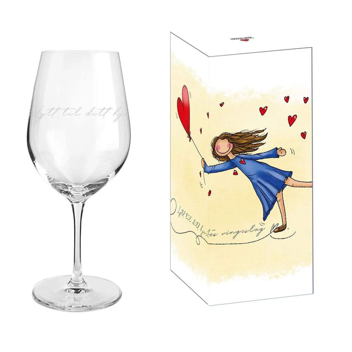 Et hjertevarmt vinglass fra Lykketegning, med teksten «Lytt til ditt hjerte» gravert i elegant håndskrift. Glass og gaveeske formidler kjærlighet, lekenhet og livsglede – perfekt som en oppmerksom gave til en venninne, søster eller deg selv. Glasset har en klassisk vinform og passer til både rødvin og hvitvin. Et glass som minner deg på å følge hjertet – i hver slurk og i livet.