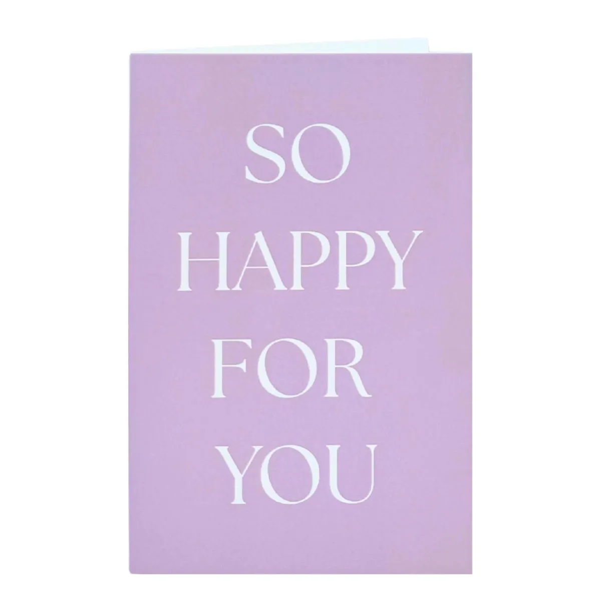 Dette kortet har teksten «SO HAPPY FOR YOU» trykket i en enkel og stilren design, perfekt for å dele din glede med noen som har oppnådd noe spesielt. Kortet er en fin måte å gratulere en venn, et familiemedlem eller en kollega med store eller små seire. Innsiden av kortet gir plass til å skrive en personlig hilsen, slik at du kan uttrykke akkurat hvor glad du er på deres vegne.
