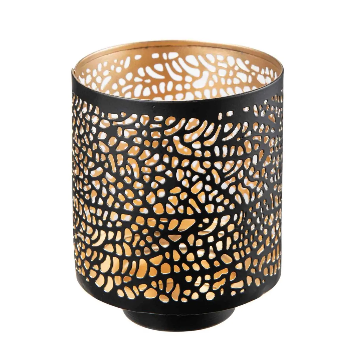 Lekker telysholder i metall. Lykten er sort på utsiden og gull på innsiden, mønsteret skaper et varmt og vakkert spill av lys fra telysflammen.