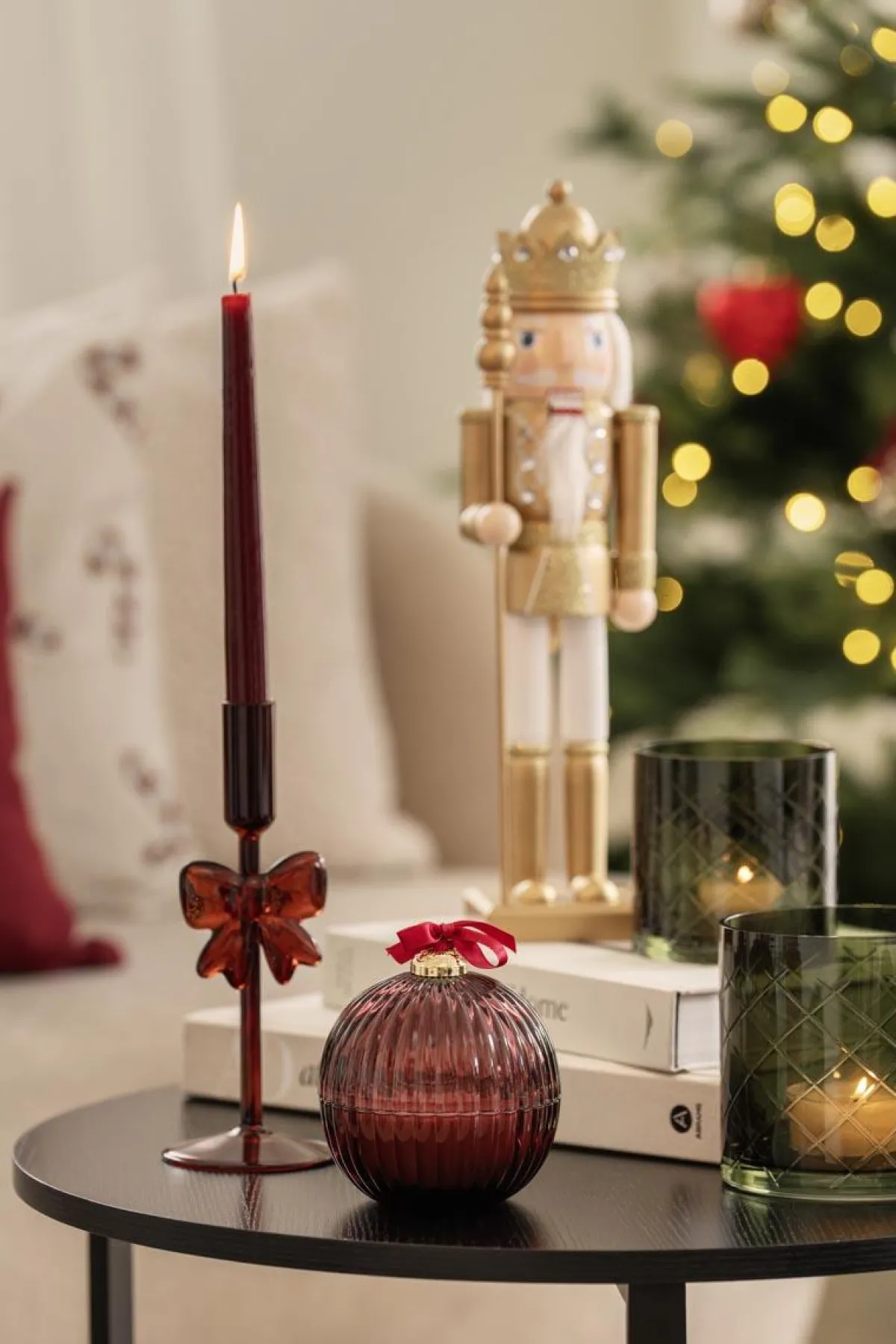 En dekorativ lysestake i rødt som sprer både varme og stemning. Den vakre sløyfedetaljen gjør den til et blikkfang, perfekt på festbordet eller som en koselig juledekorasjon. Ikke glem et for å sette stemningen!