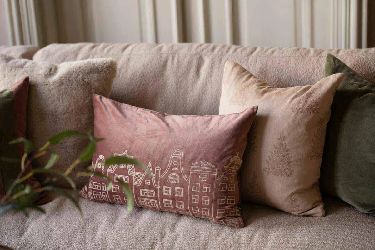 Et stilig putetrekk i støvrosa med motiv inspirert av husene i Amsterdam. Dette putetrekket kan fint kombineres med andre farger som grønn eller mer nøytrale farger som beige.