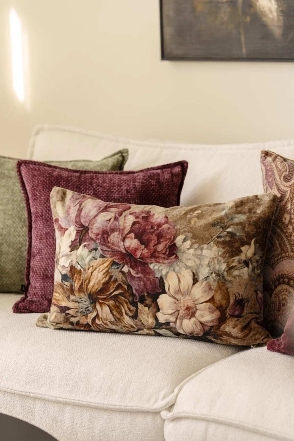 Store blomster, varme toner inviterer putetrekket til både komfort og et lite blikkfang i sofaen. Forsiden har et frodig blomstertrykk i duse farger, mens baksiden er i myk velur med en gyllen farge.
