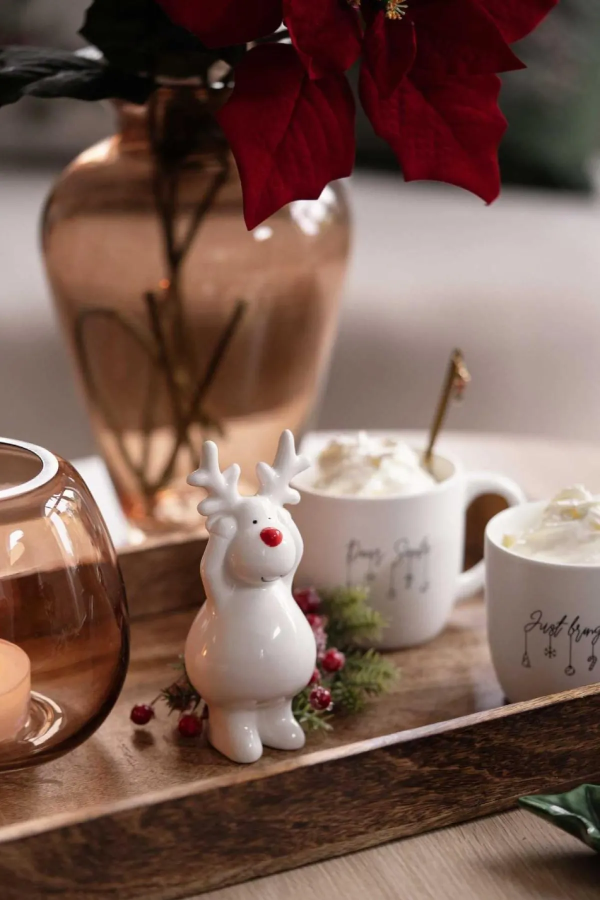 Et søtt reinsdyr med rød nese som sprer julestemning og glede. Perfekt for å pynte hjemmet til jul, dette lille reinsdyret er et sjarmerende tillegg til juledekorasjonen din.