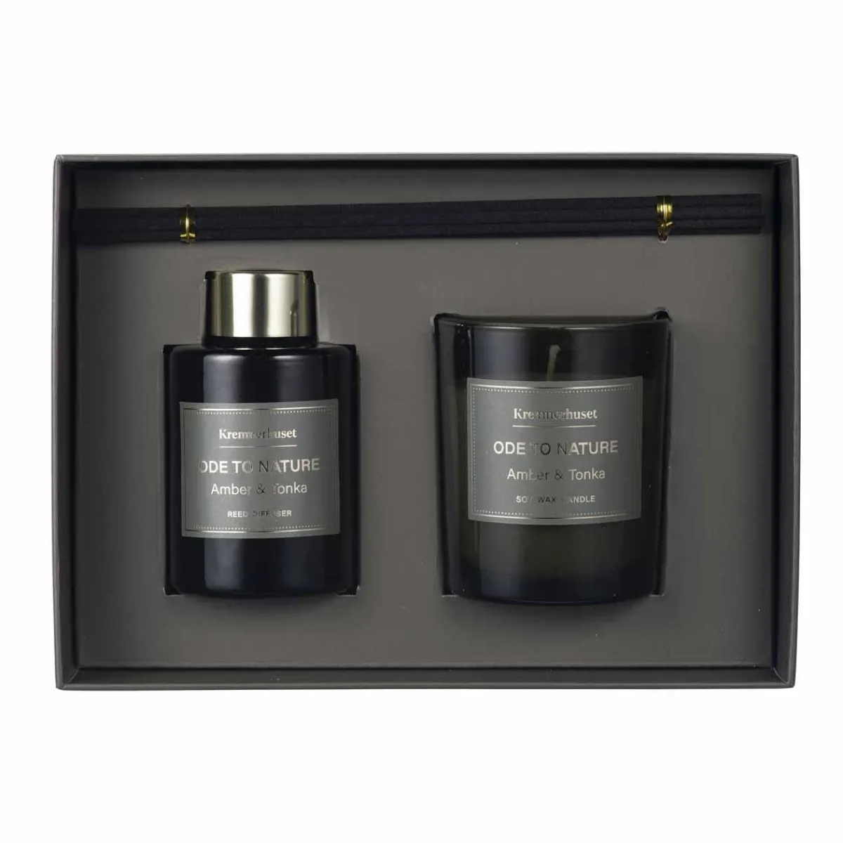 Gavesett Ode to Nature Amber & Tonka er en fin gave – enten til deg selv eller noen du vil glede. Settet inneholder en romduft og duftpinner med en varm og behagelig duft av amber og tonkabønner. En enkel måte å skape en lun stemning i hjemmet på.