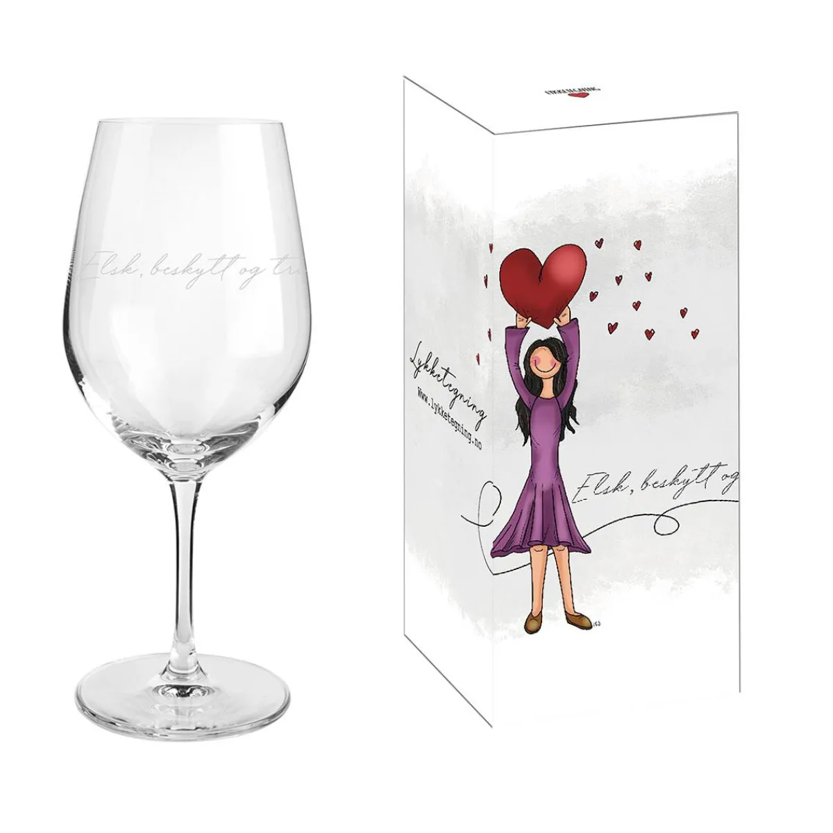 Et rørende vinglass fra Lykketegning med teksten «Elsk, beskytt og tro på deg selv» gravert langs kanten. Det følger med en gaveeske med nydelig illustrasjon som uttrykker varme, kjærlighet og omsorg – perfekt som en personlig gave til noen du er glad i. Glasset har klassisk form og passer til både rødvin og hvitvin. KOmmer i en illustrert gaveeske