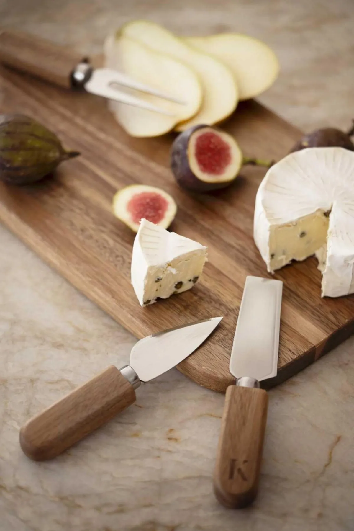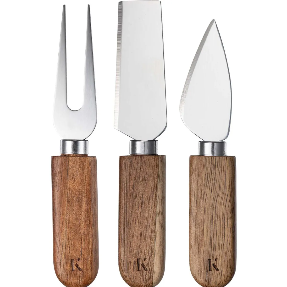 Dette settet består av tre ulike ostekniver, hver med et trehåndtak som gir et godt grep og et stilrent utseende. Settet inneholder en kniv for harde oster, en spatel for mykere oster, og en gaffel for servering. Perfekt til å komplettere ostefatet til sammenkomster, middager eller små hverdagsgleder. Vi anbefaler å rengjøre for hånd for å bevare trehåndtakets kvalitet. Ideell som gave til en osteelsker eller for å gi ditt eget kjøkkenutstyr et løft.