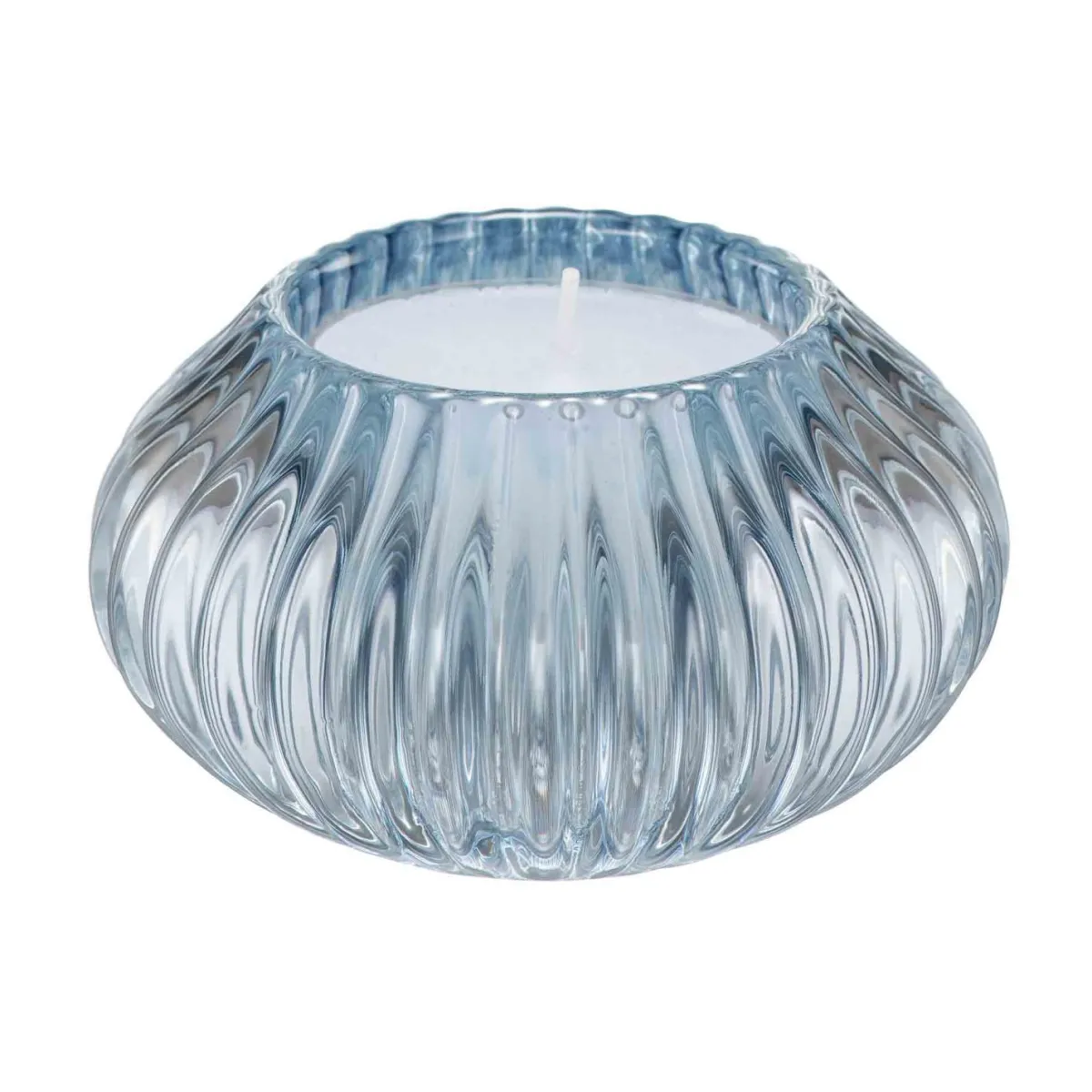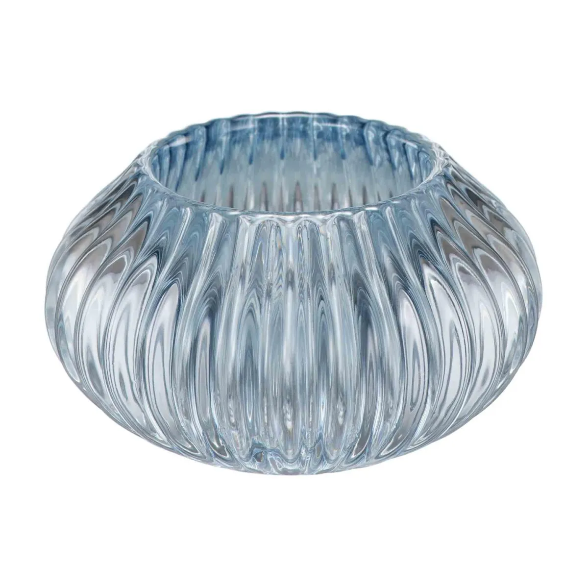 Lag et varmt og innbydende lys med denne vakre, rillede lysestaken i blått glass. Den myke formen sprer lyset på en elegant måte som gir en rolig atmosfære. Passer perfekt til små telys og fungerer godt alene eller som del av en dekorativ gruppe på spisebordet, hyllen eller vinduskarmen.