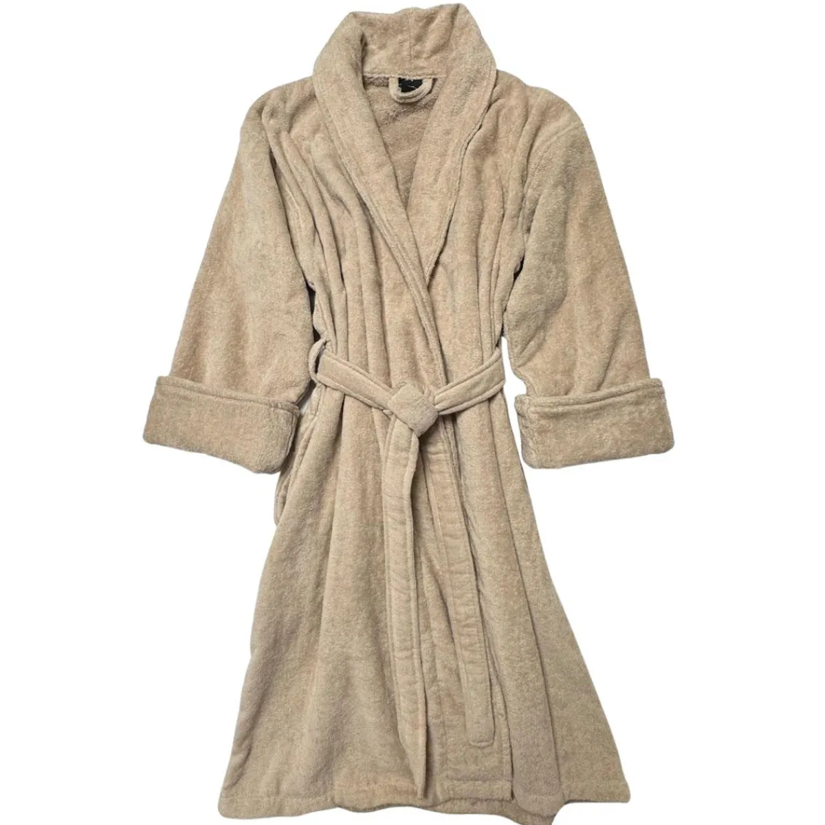 Badekåpe laget i myk beige frotté for ekstra komfort. Kåpen har praktiske lommer og knytebelte i livet – ideell for late søndager og kalde kvelder.