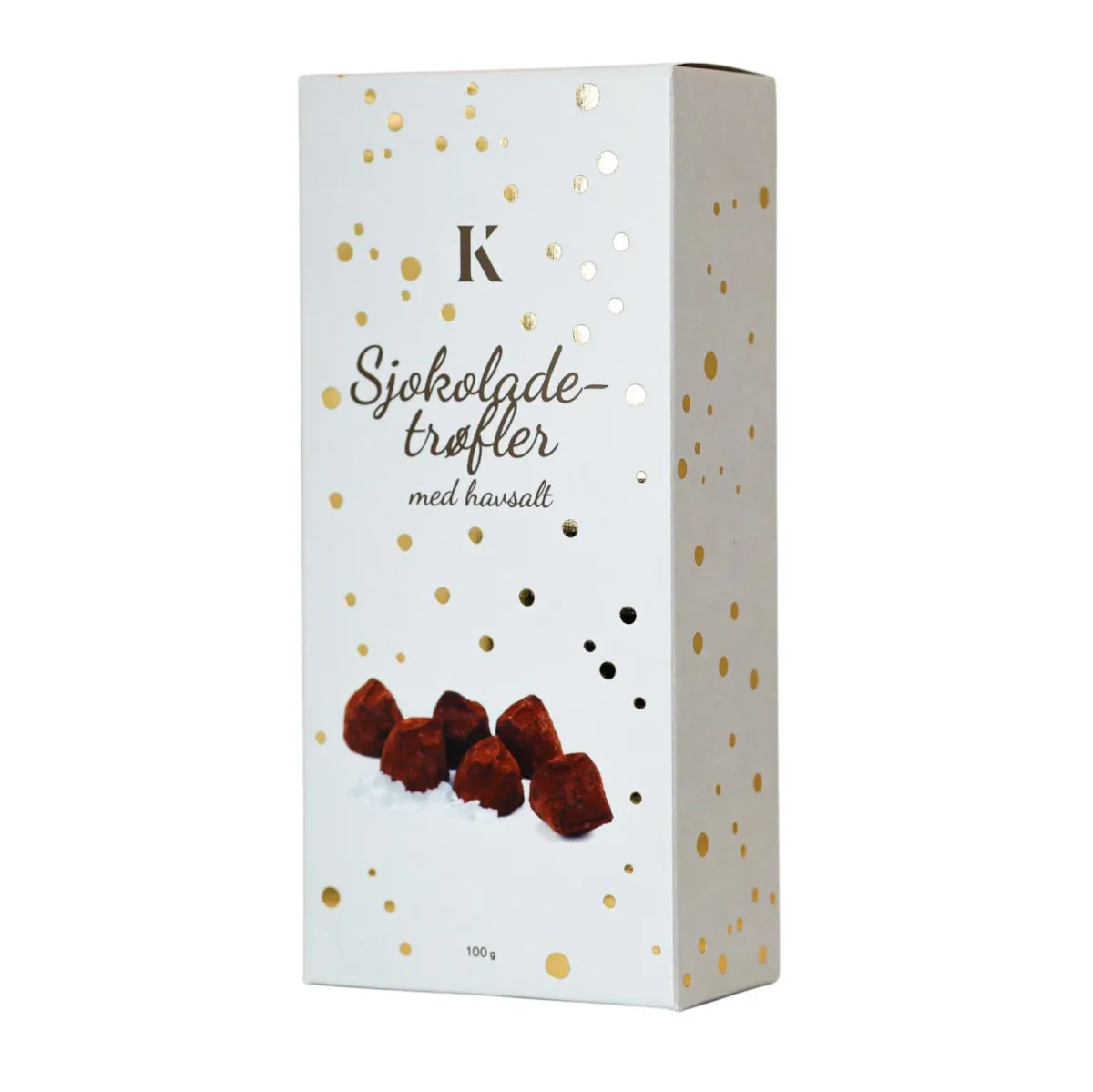 Juletrøfler med havsalt: Vegetabilsk fett (kokosnøtt, RSPO-sertifisert palmekernel) i forskjellige proporsjoner, sukker, redusert fett kakaopulver 12%, mysepulver (melk), havsalt (0,6%), emulgator (soyalecitin), smak (vanilje). Kan inneholde spor av hasselnøtter, mandler og deres biprodukter.