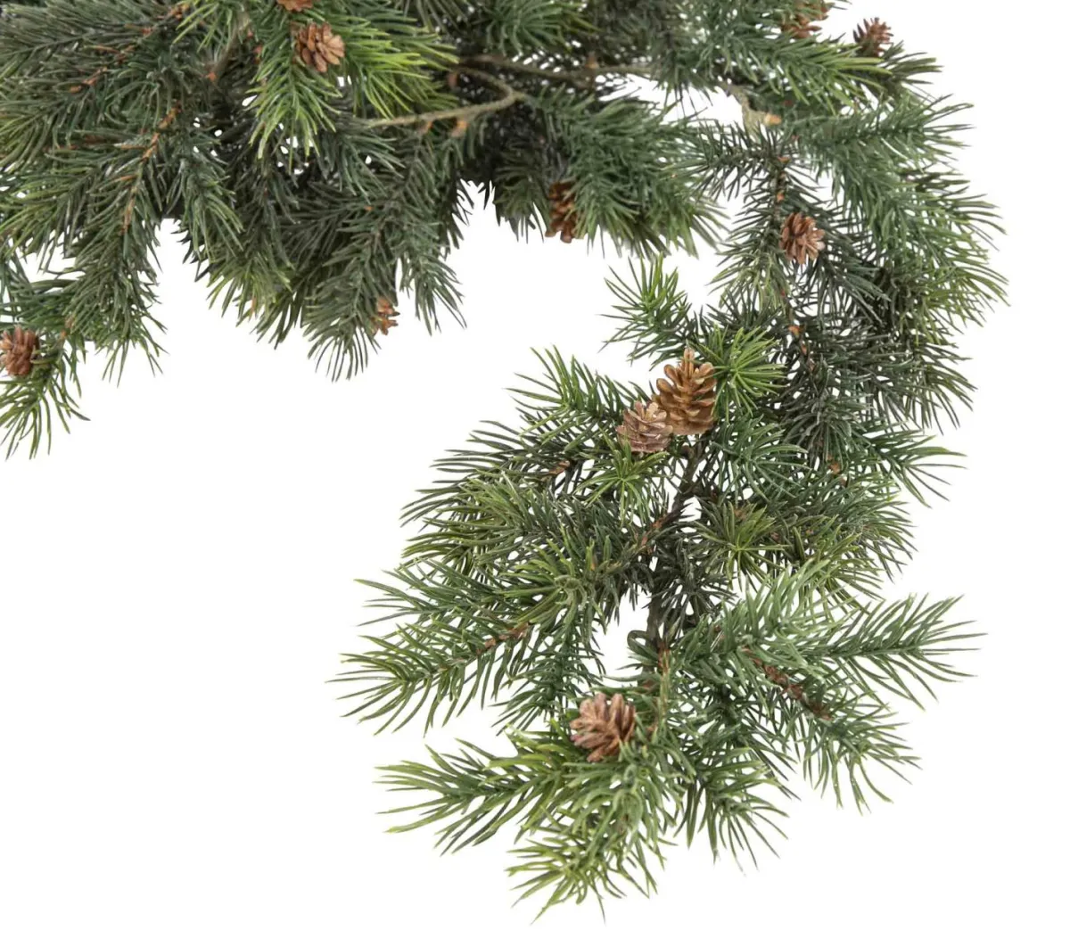 En dekorativ girlander i eviggrønn gran med små kongler. Fin til å pynte border, peishyllen eller over og rundt døren. Stemningsfull julepynt som tar naturen inn på en enkel måte.