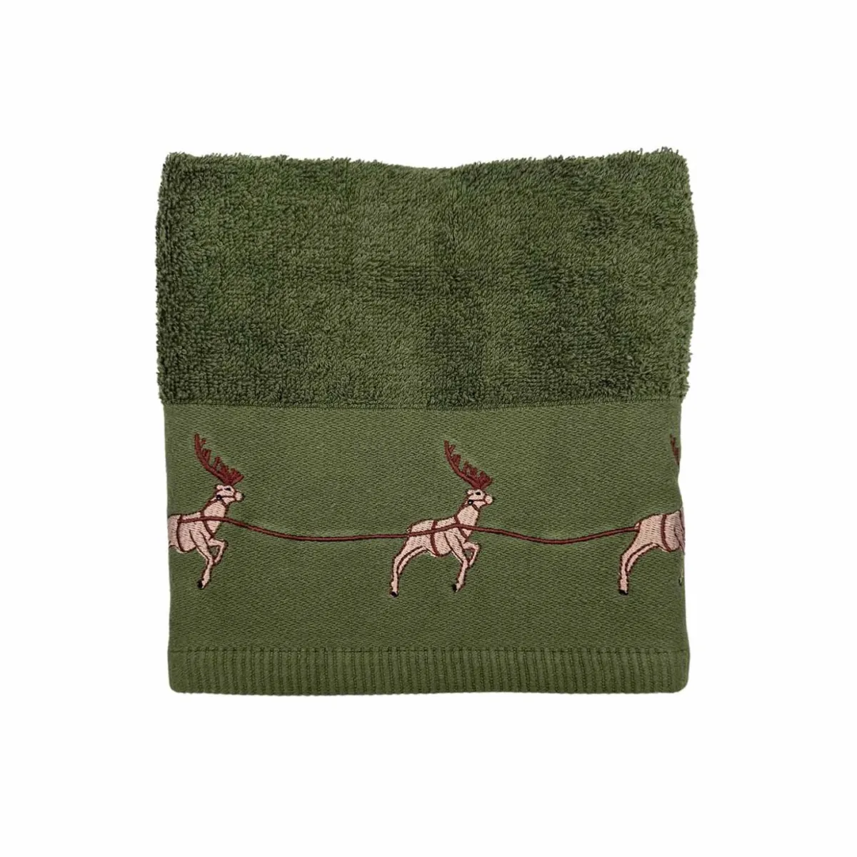 Dette grønne håndkleet er pyntet med en sjarmerende rad av reinsdyr brodert langs kanten. Perfekt for å tilføre litt juleglede på badet eller kjøkkenet. Laget av mykt materiale som gjør det behagelig å bruke til både hender og ansikt. En fin måte å feire høytiden på med praktiske detaljer som kan brukes hver dag. Lett å vaske og holde rent, slik at det kan tas frem år etter år. Passer også godt som en liten gave til noen som liker å pynte til jul.