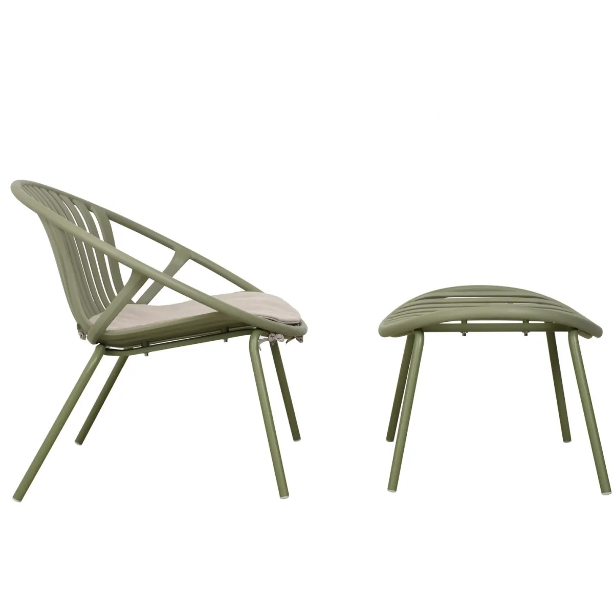 Ser du ute etter en trendy og komfortabel stol til uteplassen? Sjekk ut denne fine utestolen i dus grønn. Denne hagestolen har et rundt design som gjør den lekker å se på og sitte i. Den kommer med en stol pute og fotskammel, så her kan du virkelig strekke deg ut. Den kommer også i en herlig !