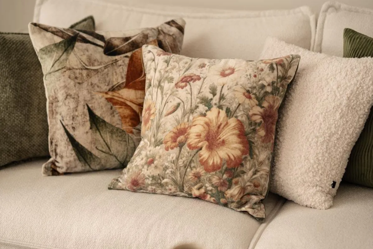 Et blomsterhav i dype gule, grønne og rusttoner gir en lun følelse gjennom hele sesongen. Putetrekket har et nostalgisk uttrykk. Kombiner gjerne med grove tekstiler, nøytrale eller velurputer i varm grønn eller brent oransje for et mykt og samstemt uttrykk i sofaen.