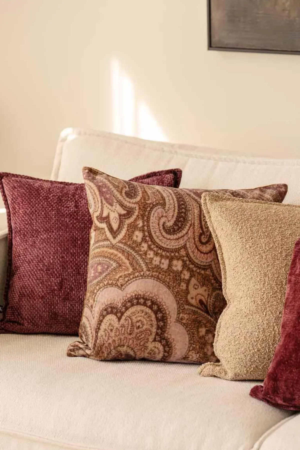 Velur pute med paisley mønster. Fargene går i rolig rosa og brunt, og gir puten et varmt uttrykk som passer ekstra godt til sesongen. Kombiner gjerne med flere i velur, eller miks inn andre teksturer som lin og bomull.
