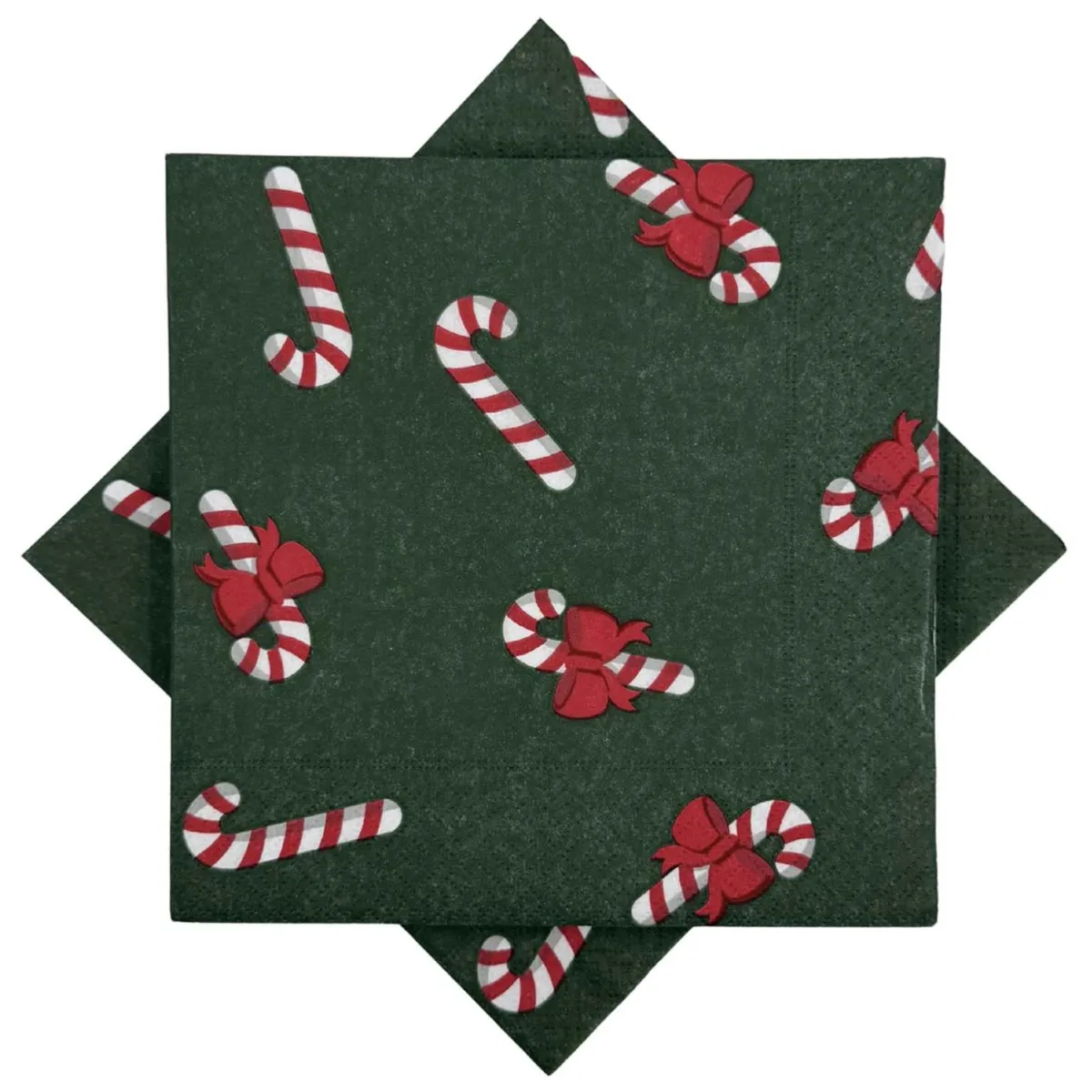Grønn serviett dekorert med røde og hvite candy canes, noen med sløyfer, gir en leken julestemning til borddekkingen. Perfekt til både hverdags og fest.