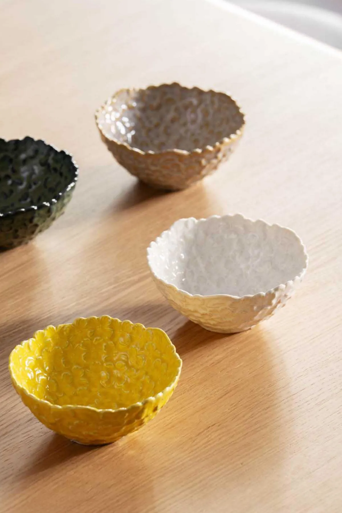 Dekorativ gul skål, med småblomstrete struktur. Fin som et ekstra tilskudd til serviser eller til frukt og bær.