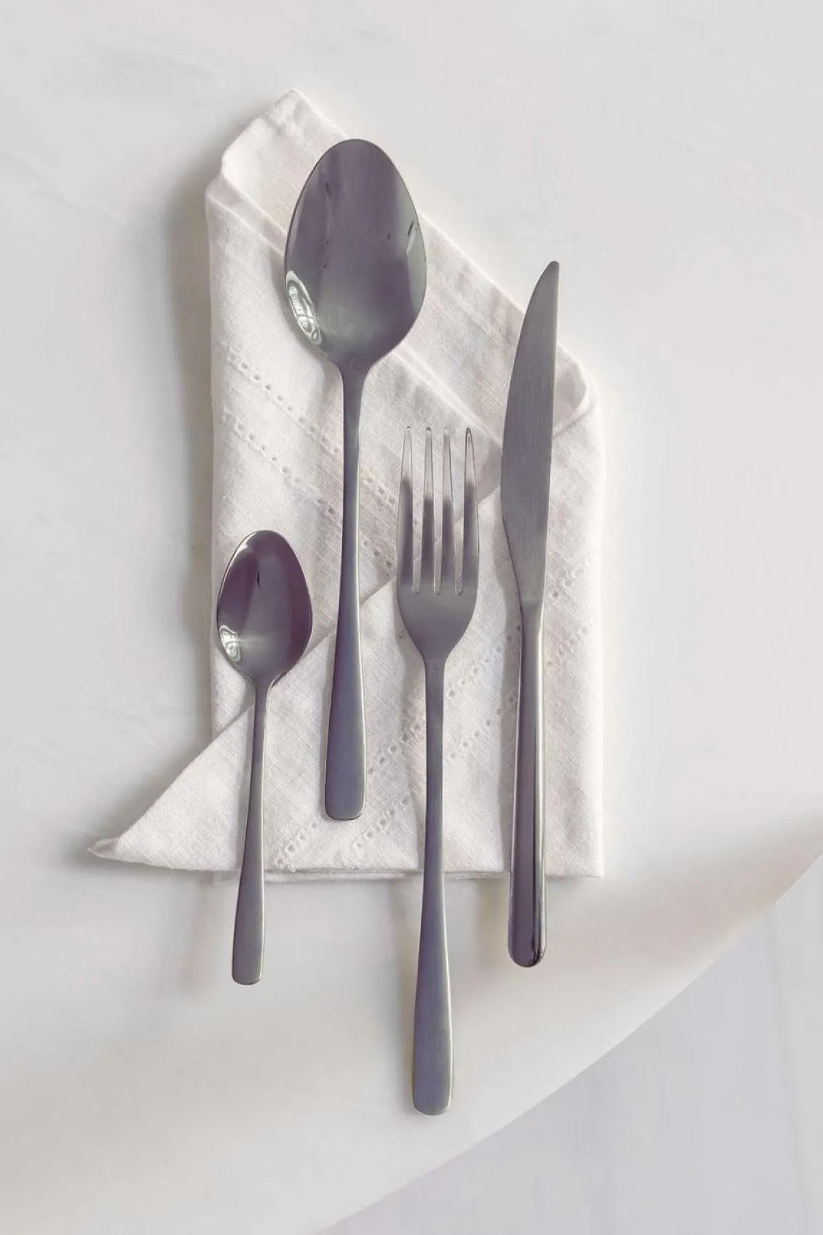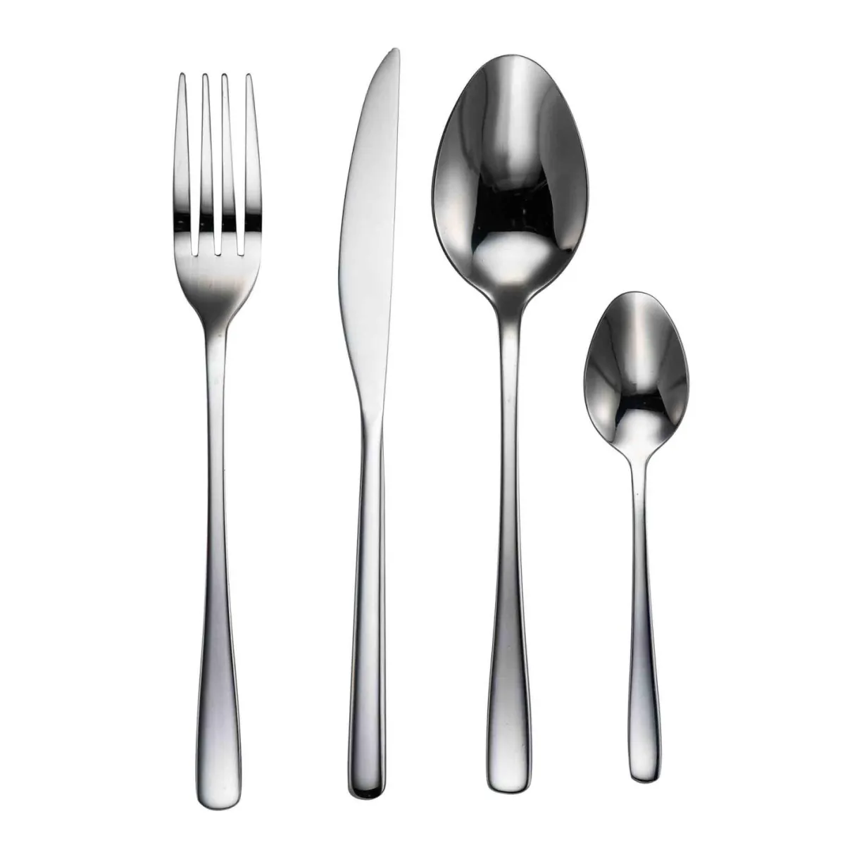Elegant og stilrent sølvfarget bestikksett bestående av kniv, spiseskje, gaffel og teskje. Det elegante designet tar borddekkingen til nye høyder og passer til både hverdagsmiddagen og fest.