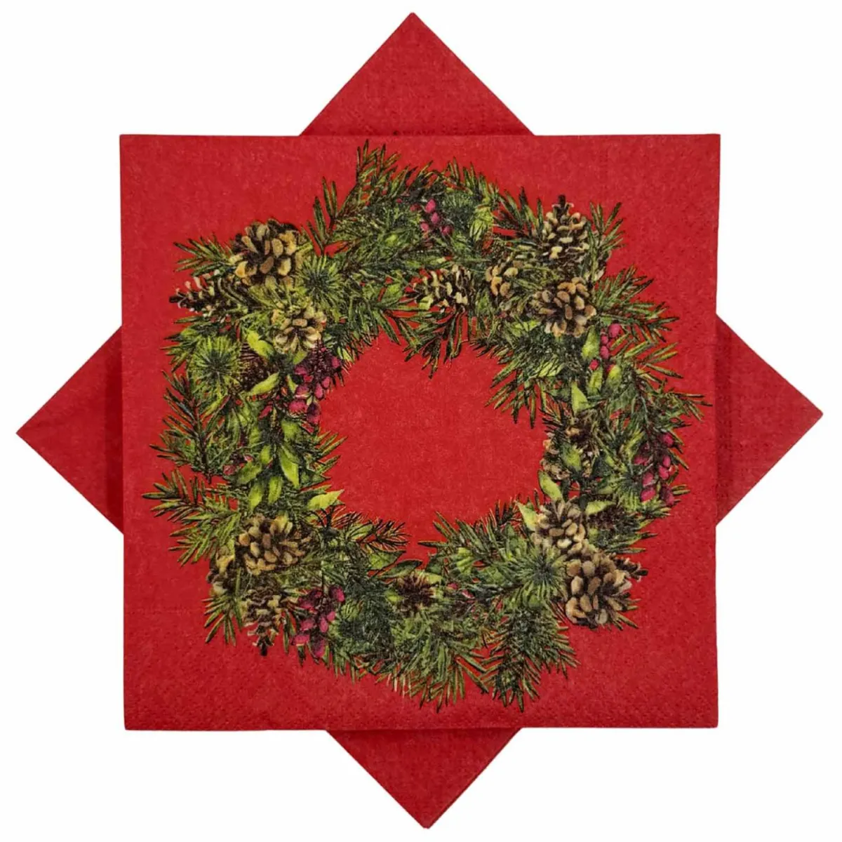 Rød serviett med dekorativ julekrans i varme grønntoner og naturinspirerte detaljer som kongler og røde bær. Perfekt til dekking av et klassisk julebord.