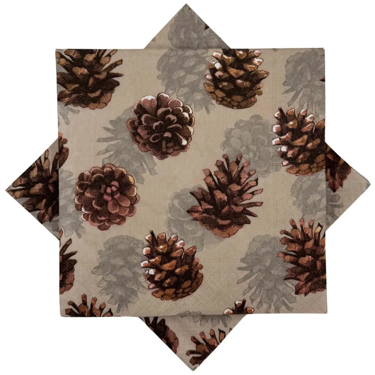 Papirserviett med koselig konglemønster i varme bruntoner. Perfekt til vinterlige borddekkinger eller som et lunt innslag til julemåltidet.
