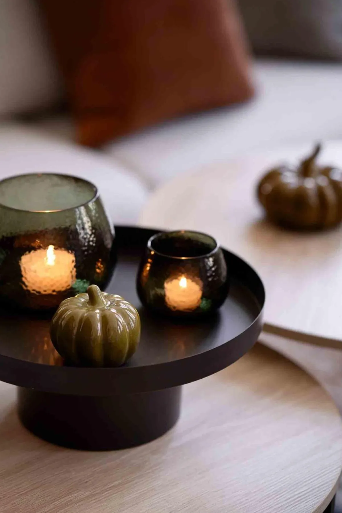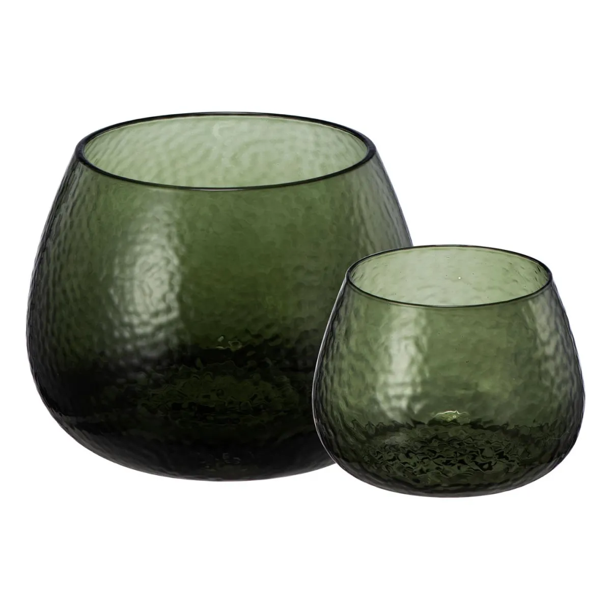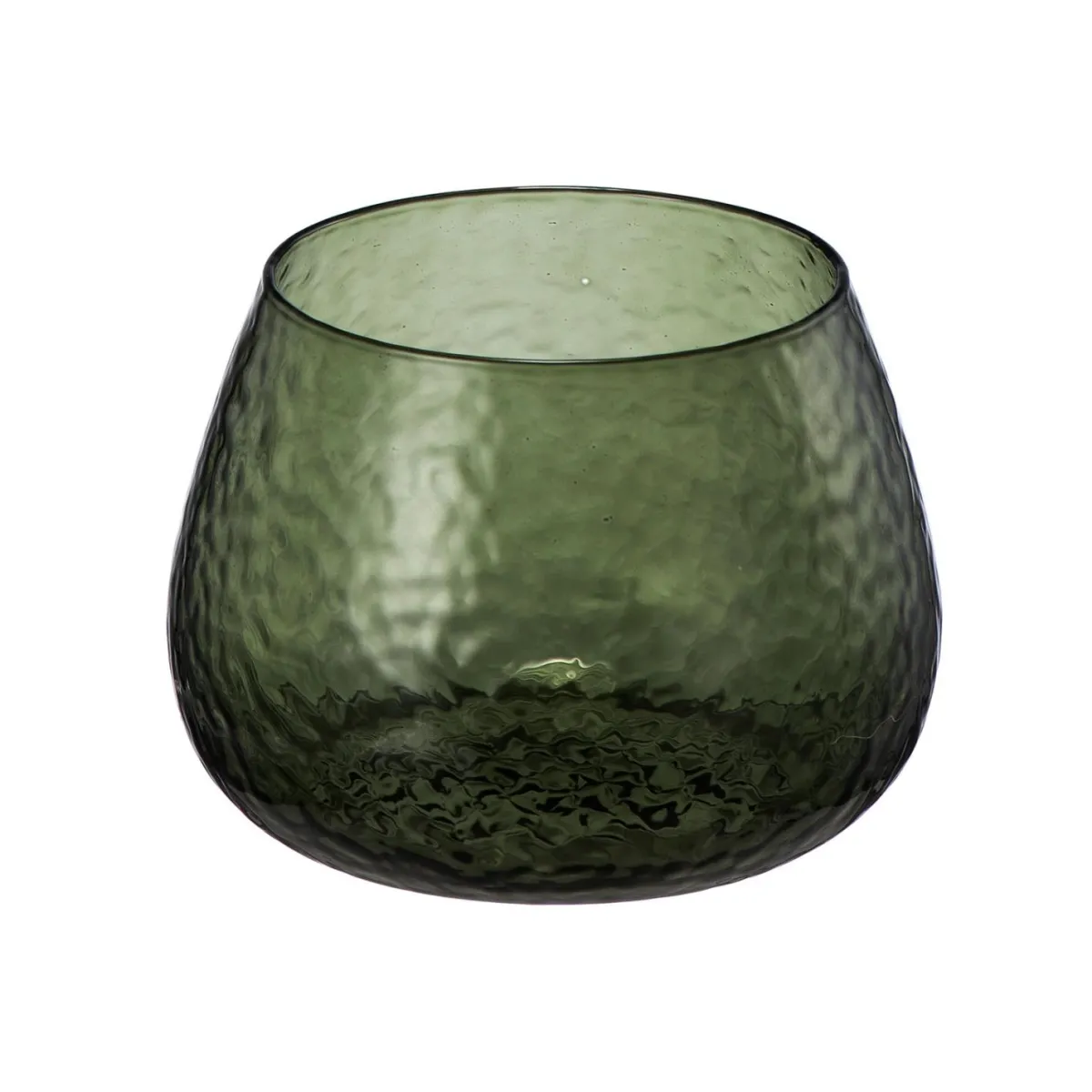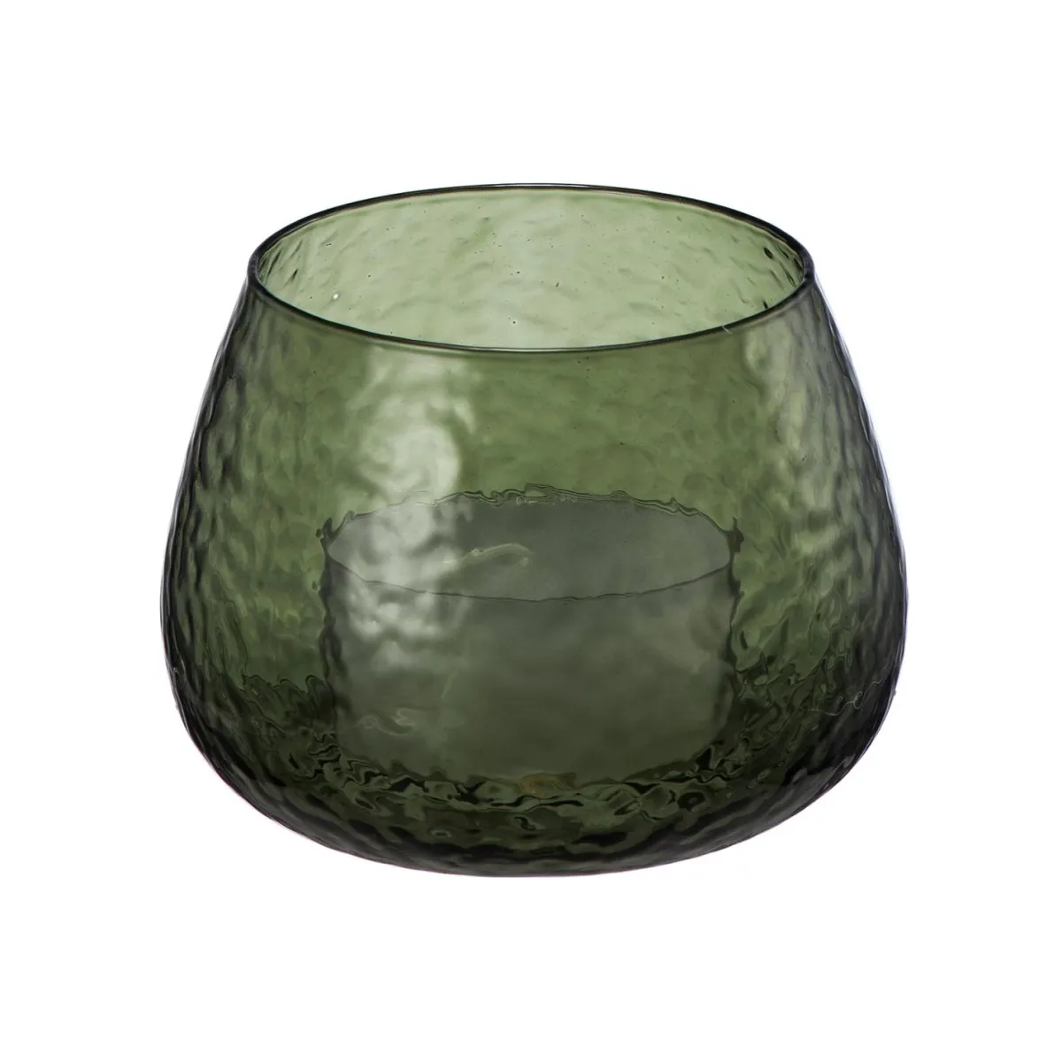 Nydelig telysglass i grønnfarget banket glass som leker med lyset fra telyset. Pynt opp på lysfatet eller på stuebordet. Telysholderen fås i flere farger og størrelser, se hele .