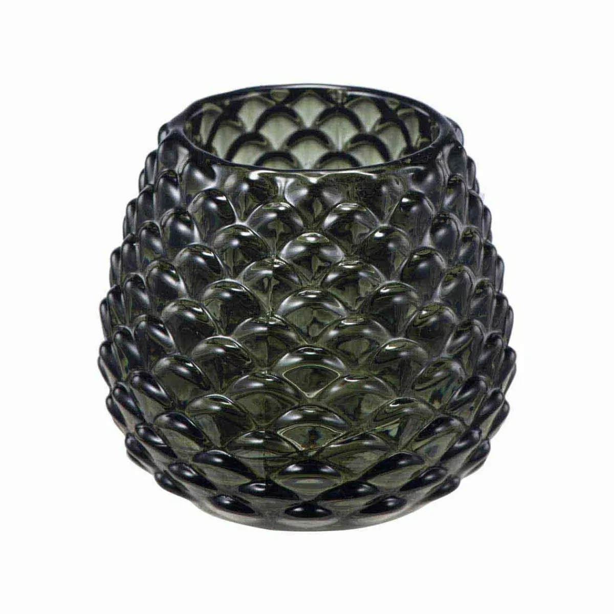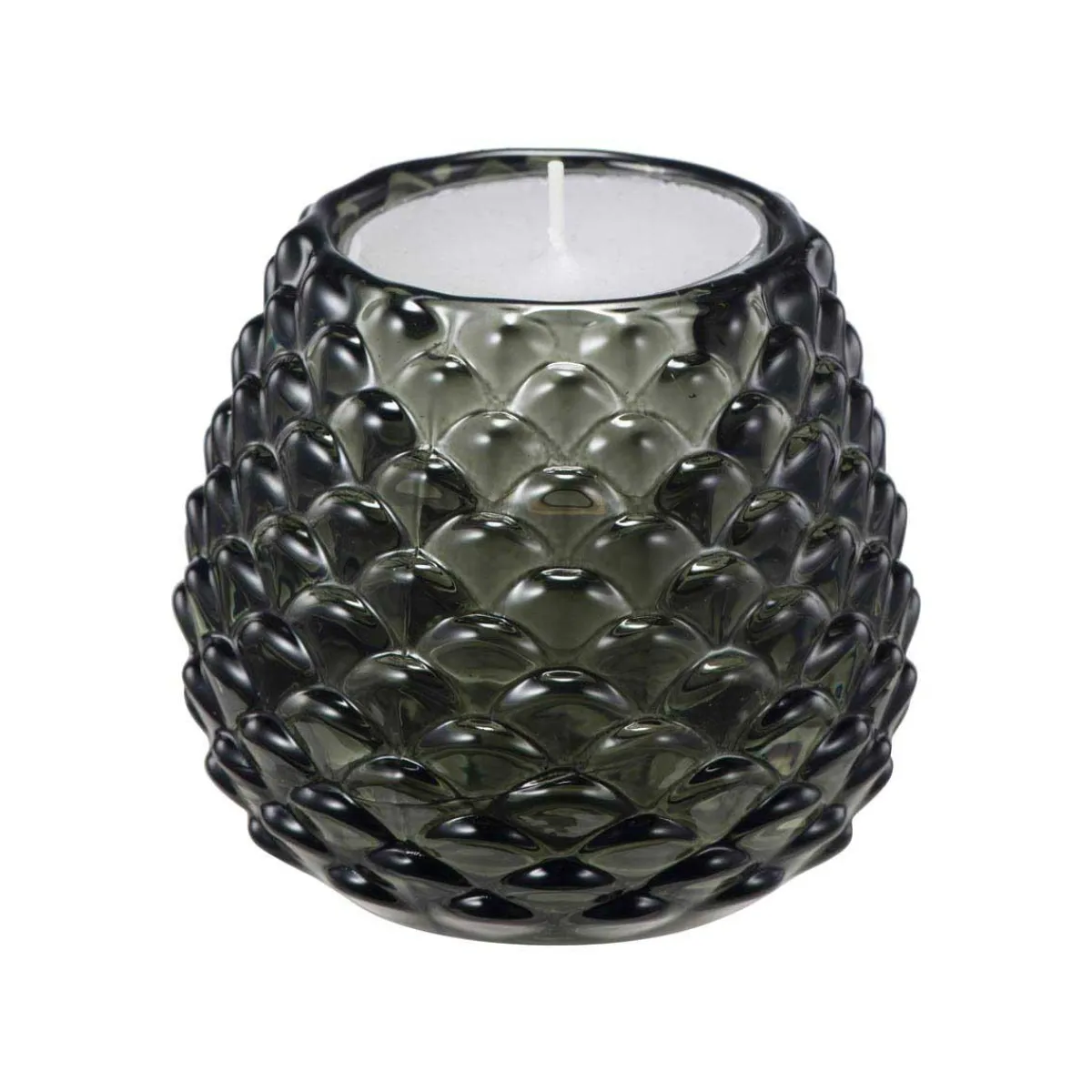 En kongleinspirert telysholder i grønt glass. Den mørkegrønne tonen gir et lunt uttrykk, og med et telys inni får du et nydelig spill i overflaten. Plasser den gjerne på et sammen med andre i ulike former for å skape koselig høststemning.
