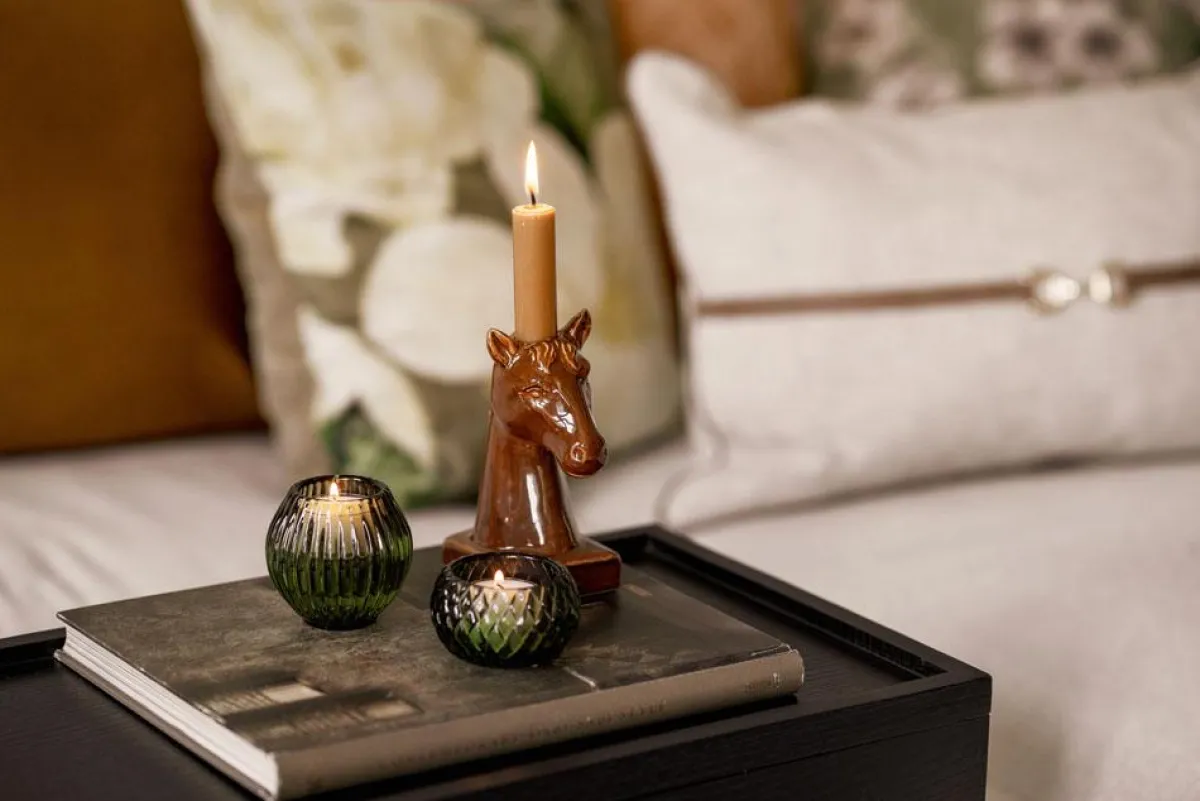 Rubi telysholder har et strukturert rutemønster i dyp grønnfarge som skaper en lun glød når lyset tennes. kommer i flere farger, så du kan mixe og matche slik du ønsker.
