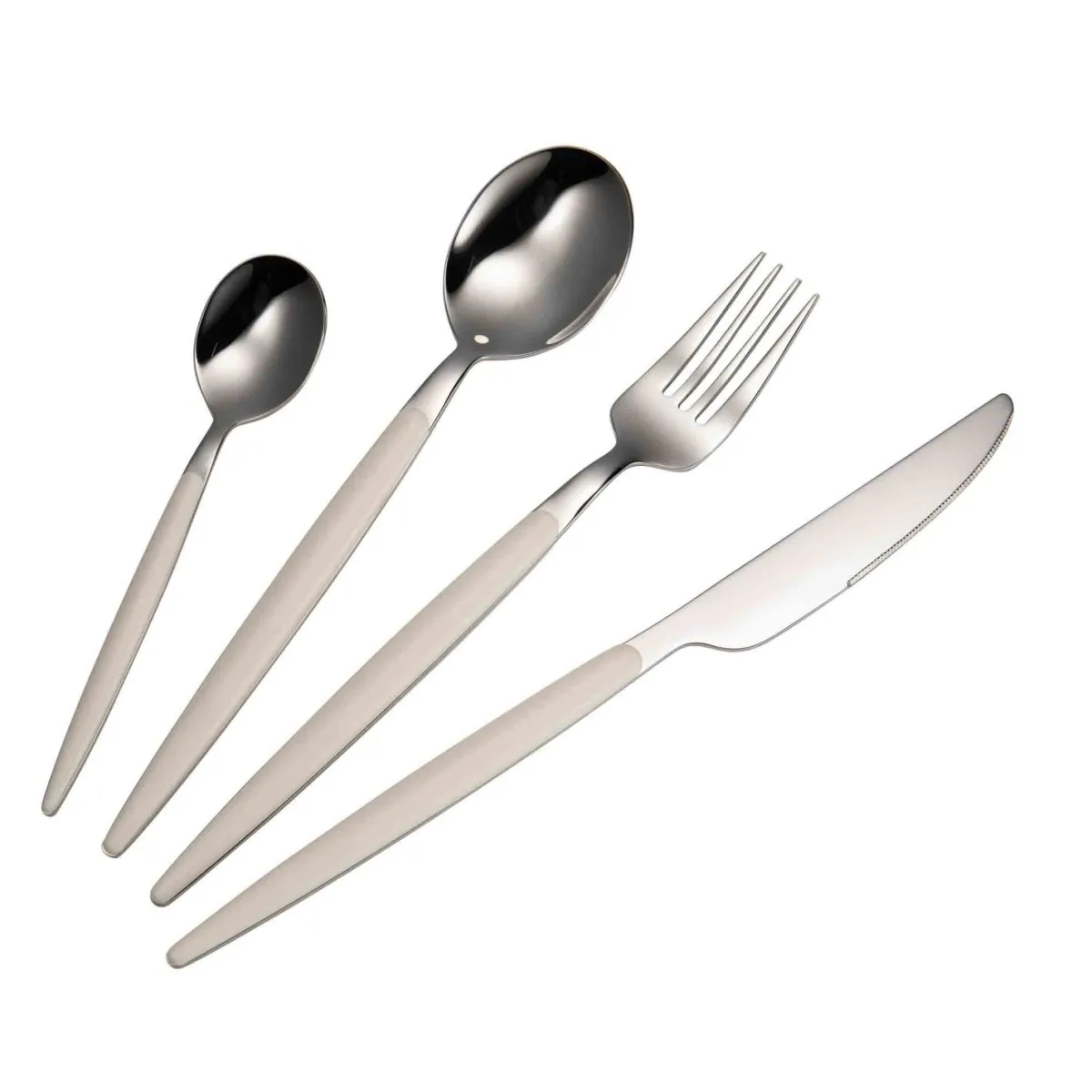 Dette bestikksettet for 4 personer kombinerer retrodesign med både klassiske og moderne elementer. Håndtakene er laget av PP-plast, som sikrer at bestikket tåler oppvaskmaskin uten å bli matt eller flisete. Laget av høykvalitets stål (18/8, med knivblad i 13/0), er bestikket motstandsdyktig mot flekker og korrosjon. Vær imidlertid oppmerksom på at selv de beste legeringene kan svekkes ved kontakt med etsende eller syreholdige matvarer, salt, hardt vann eller sterke vaskemidler. For best resultat, vask bestikket på et skånsomt oppvaskmaskinprogram.