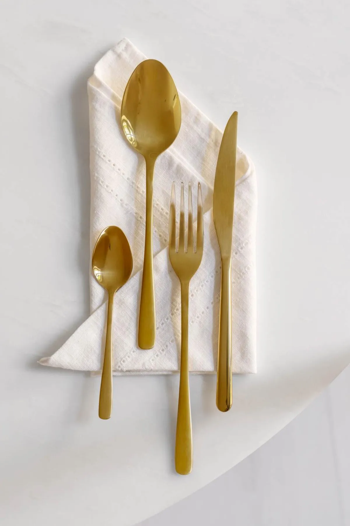 Nydelig, gullfarget bestikksett bestående av kniv, spiseskje, gaffel og teskje. Det elegante designet tar borddekkingen til nye høyder og passer likegod til hverdagsmiddagen som til fest.