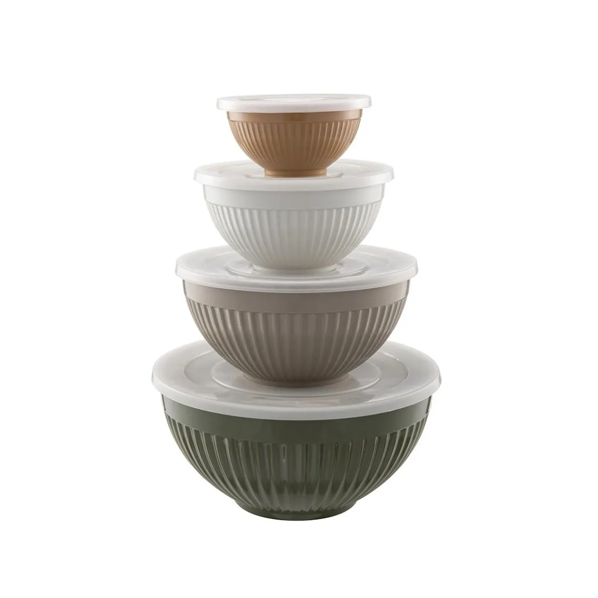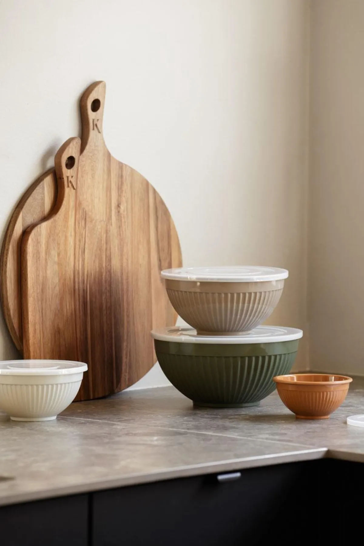 Fine og praktiske boller i melanin, med lokk. Bollene kan stables i hverandre og er perfekt til matlaging og oppbevaring.