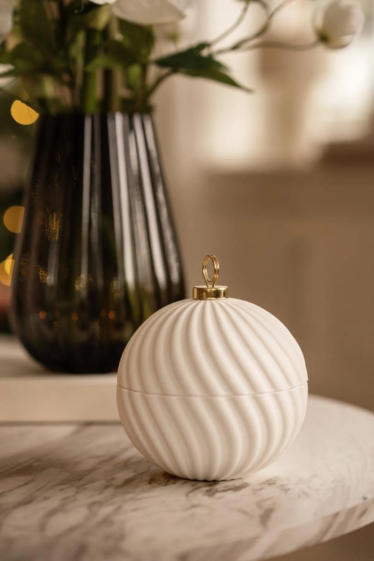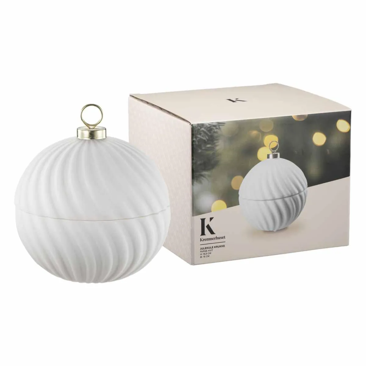 Nydelig krukke i hvit porselen som kan brukes til oppbevaring på stuebordet eller i hyllen. Formet som en julekule og passer derfor perfekt inn som den siste prikken over i’en i juledekorasjonen.