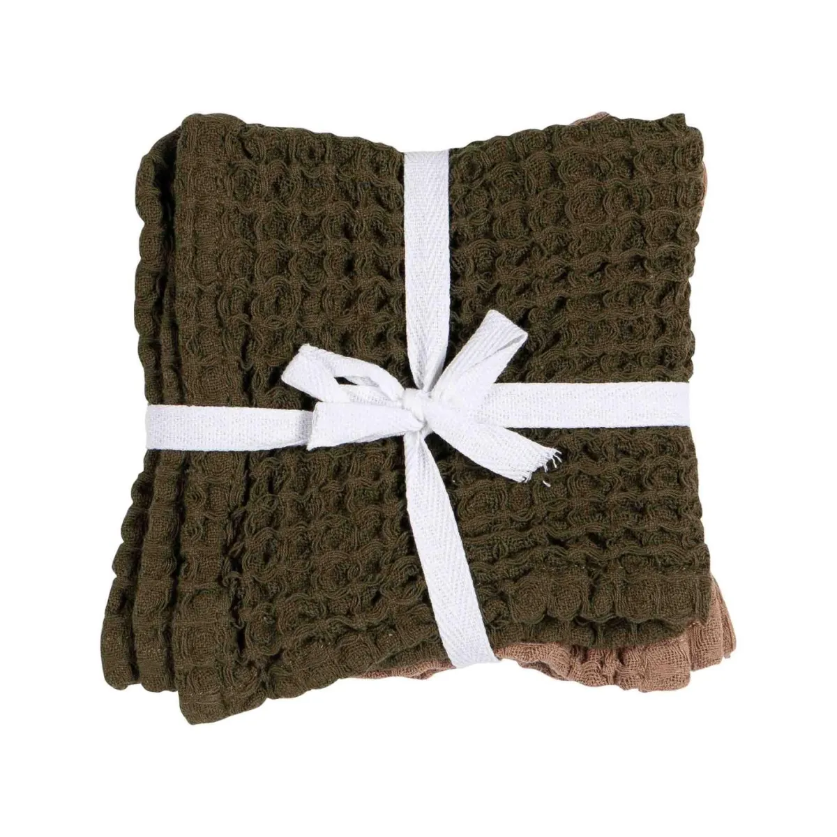 Disse kjøkkenklutene i grønn og brun farge er laget av 100 % bomull og har en elegant vaffelvevet struktur. De er både myke og slitesterke, perfekte for å tørke opp søl og rengjøre overflater. Settet inneholder to kluter som kombinerer funksjonalitet med stil, og gir kjøkkenet ditt et fargerikt løft.