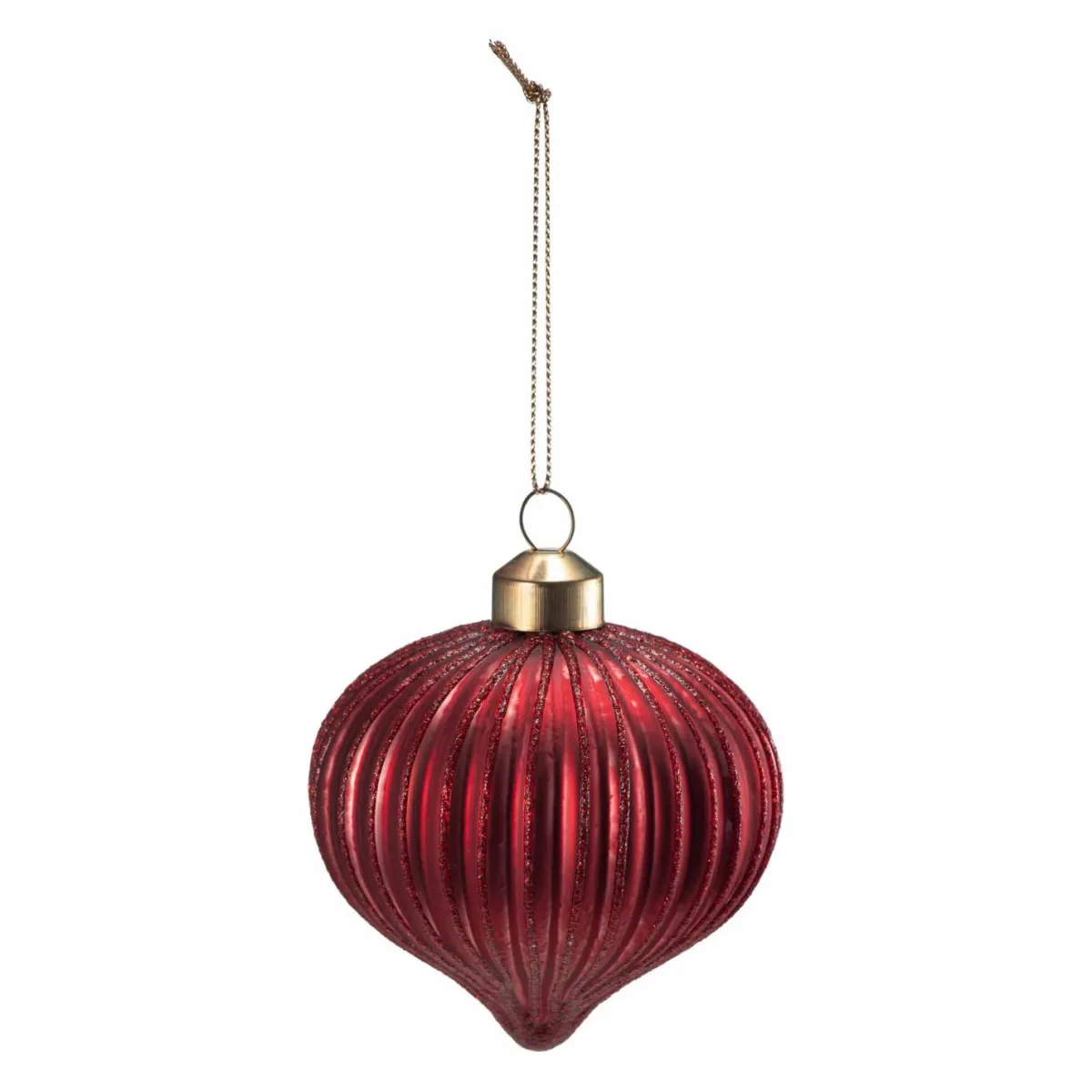 Nydelig rød julekule i glass med riller. Morsom og leken form som passer perfekt på juletreet denne julen. Frisk opp og pynt et tre som gjenspeiler din smak og personlighet. Kombiner den gjerne med de andre fargene av .