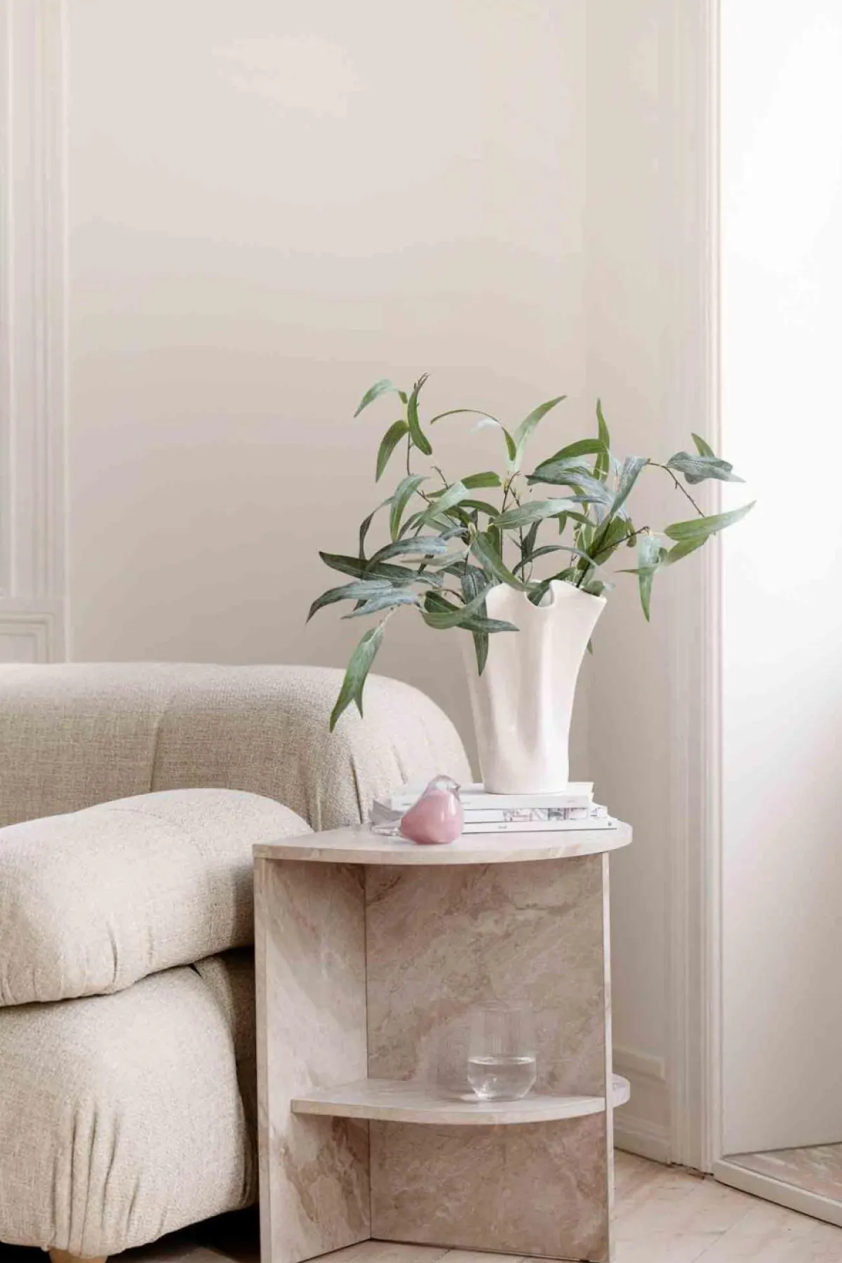 Trendy sidebord med beige marmor finish. Den har en flat side, så den kan settes tett ved siden av sofaen eller mot en vegg. Den har en stor flate og to mindre hyller under for mer lagring.