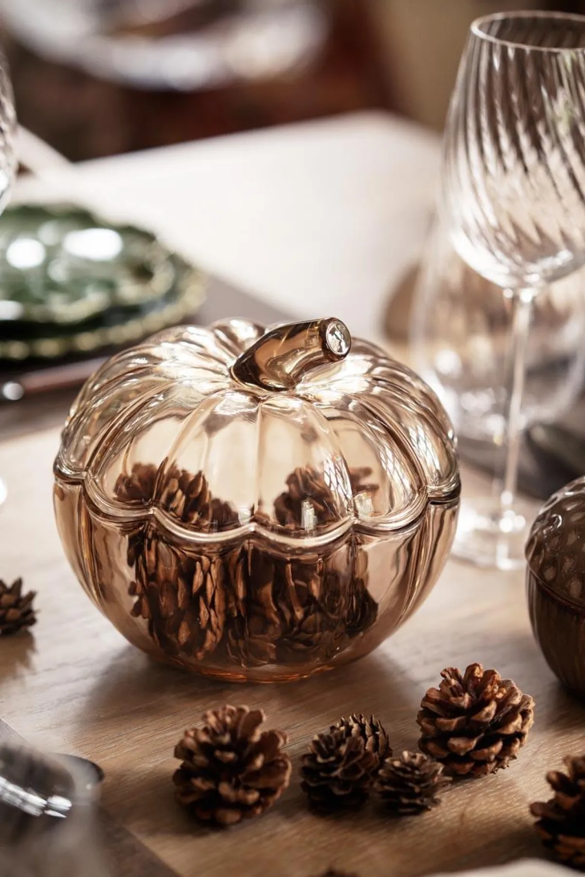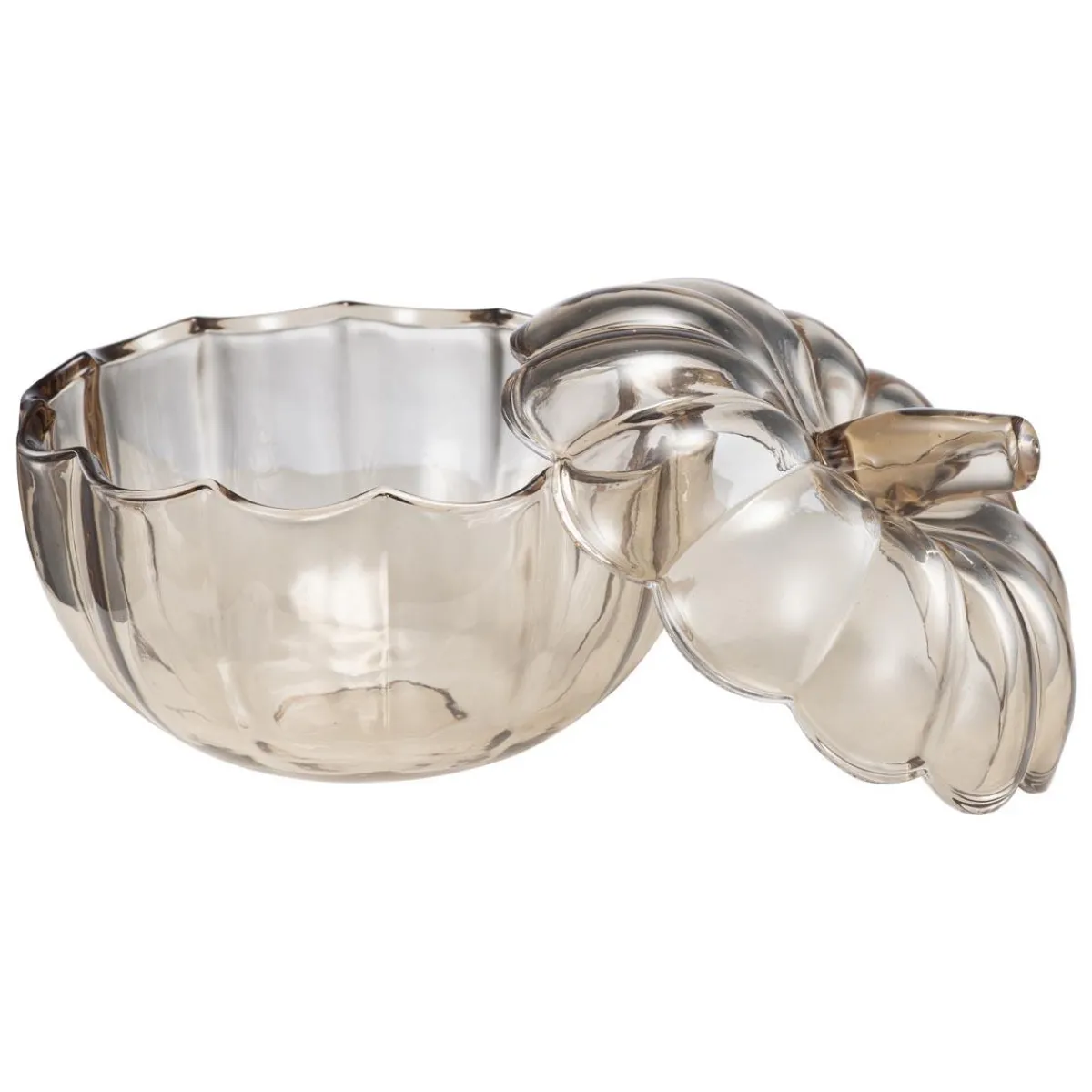 Glasskrukke formet som et gresskar, med lokk som enkelt kan løftes av. Perfekt for å oppbevare smågodtet til alle som kommer på døra for knask eller knep. Passer også godt som dekor på bordet gjennom Halloween-sesongen. Den lyse, delikate glansen gir et mykt uttrykk, som balanserer fint mot mørkere innslag i interiøret.